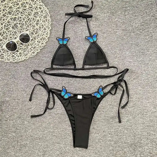 2022 cheap price Cutout Triangle Cup Bikini with Butterfly Embroidery women sexy swimwear high waist lace up bandage swimsuits