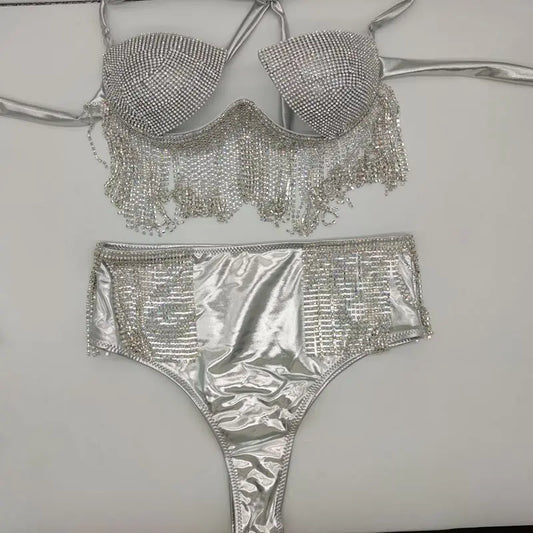 2021 vacation sexy Tassels diamond bikini set popular chain rhinestone swimwear push up women beachwear hot swimsuit