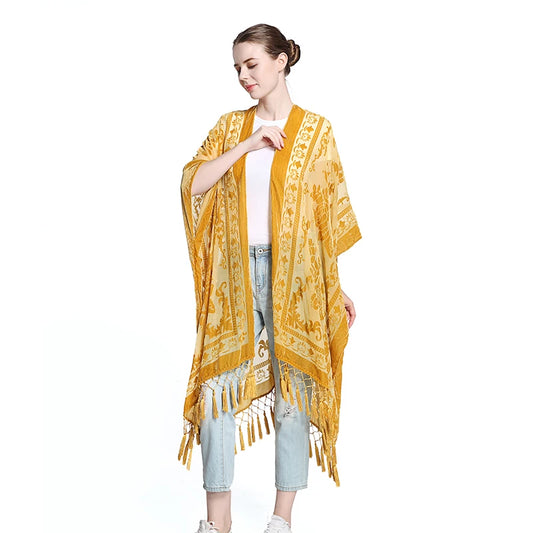 WeHello Burnout Velvet Kimono For Women Luxury Fashion Long Cardigan With Tassel Beach Cover-up Holiday Cardigan Shawl