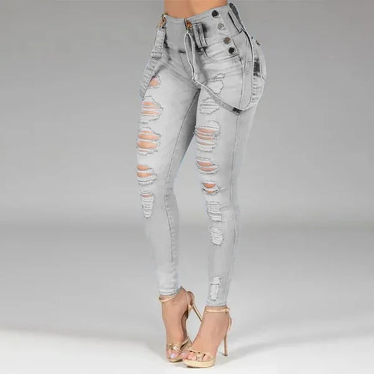 Women Jeans High Waisted Straight Skinny Stretchy Pant Streetwear Ladies Hole Washed Bandage Denim Pencil Pants Trousers 2022