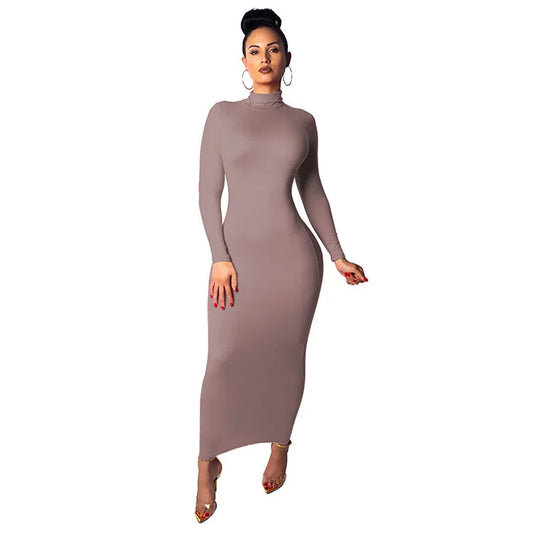 Women Lady Vestidos Ruched Long Sleeve Sheath BodyCon Midi Sexy Dress