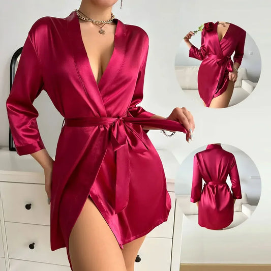 Women Summer Solid Color Ice Silk Nightdress Midi Dress Bath Robe Waist Belt Sleepwear Nightgown Lady Homewear
