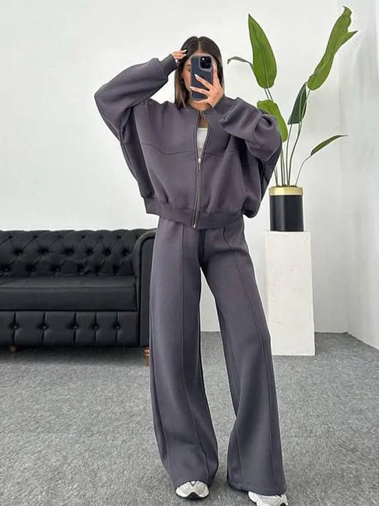 Women Sweatsuit Set Vintage O-neck Zipper Bomber Jackets High Waist Loose Pants Suit Female 2025 Spring Fashion Lady Sportswear