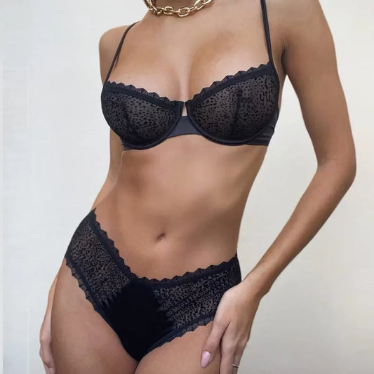 Wriufred Flocking leopard print lingerie set sexy perspective temptation hot ultra-thin bra set ladies underwear set