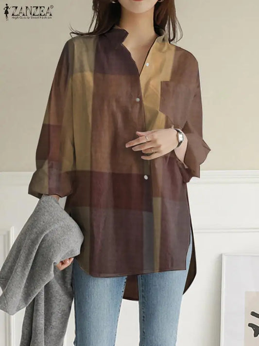 ZANZEA 2024 Summer Plaid Check Shirts Vintage Long Sleeve Blusas Women Fashion Irregular Blouse Oversized Female Casual Chemise