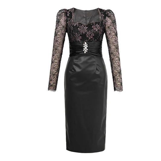 ZYHT 70152 High Waist Lace Stitching Pu Leather Skinny Pencil Midi Dress Tight Corset Long Sleeve Sexy Dresses