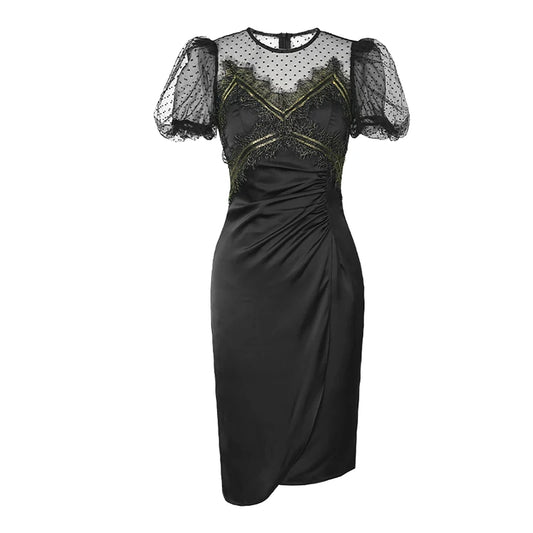 ZYHT 40062 Custom Ladies Summer Trending Crew Neck Black Front Slit Pleated Sexy See through Patchwork Dress