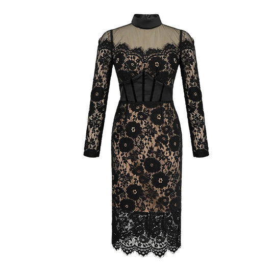ZYHT 20767 See-through Mesh Stitching Lace Hollow Out Sexy Dress Women Stand Collar Sheer Corset Dress