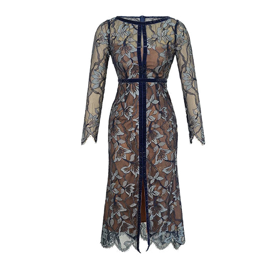 ZYHT 20770 Perspective Sexy Embroidery Floral Print Wave Hem Dress Long Sleeve Front Split One Piece Dress
