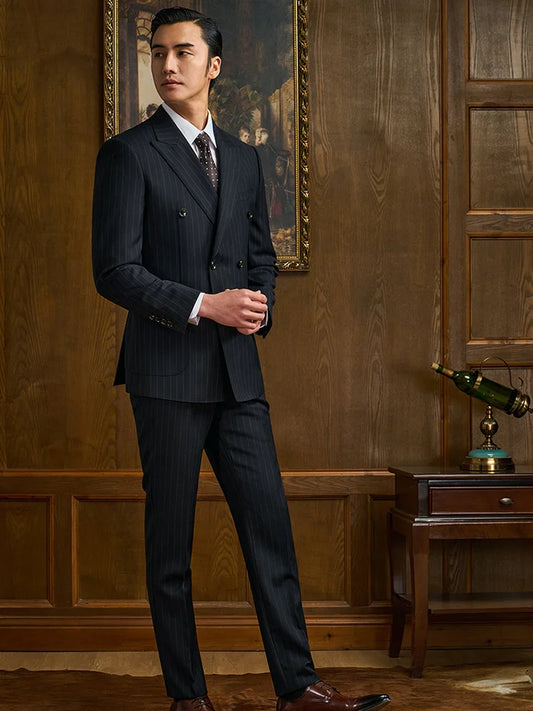 100% Wool Suits For Men Blazer Sets Jacket Vest Pant Double Breasted Striped 2022 Wedding Groom Wear Slim Fit Daily Clothing