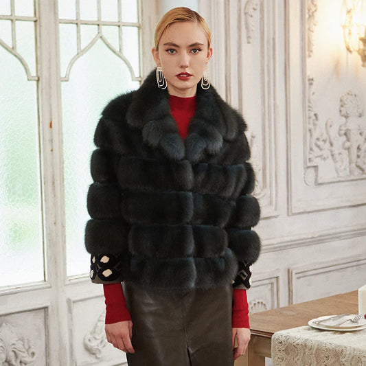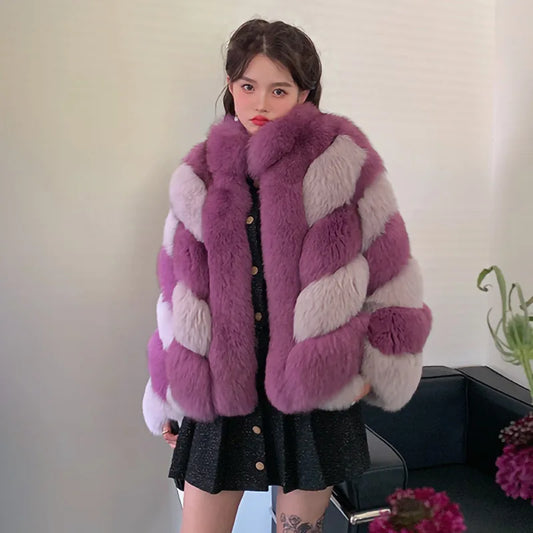 Sweet Trendy Solid Color Diagonal Stripe Design Short Fur Coats Real Fox Fur Coats for Women