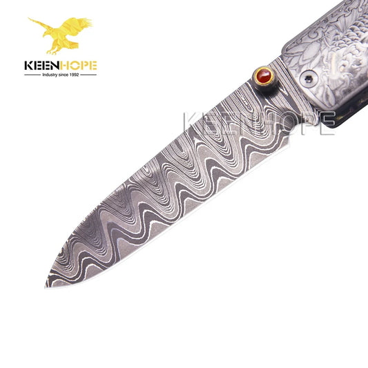 z-Luxury Damascus Folding Knife Pocket Knife Hand Engraved Gilded Koi Fish Fritillaria Handle Mike Norris Composite Ladder Pattern