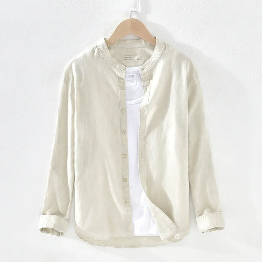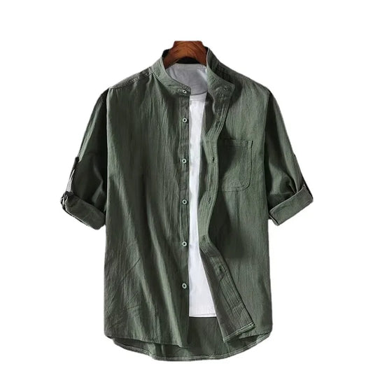 Supply high quality casual breathable men's linen cotton long sleeve stand collar shirts