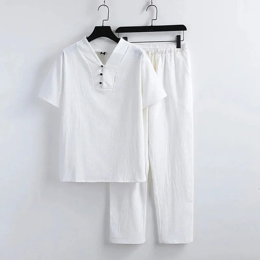 New Arrival Men's Cotton and Linen Short Sleeve T-shirt Shorts Pant Set Solid Shirt+Trousers Home Suits Male Size M-5XL