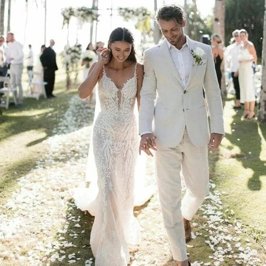 Summer Beige Linen Mens Suits Grooms Wedding Tuxedos Terno Masculino Slim Fit Prom Party Costume Homme 2 PCS (Blazer+Pants)