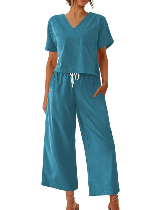 Women's Sleepwear 100% Cotton Linen Lounge Set Short Sleeve Top Pajamas Wide Leg Pants Loungewear Outfits Pocket S-XXL Plus Size