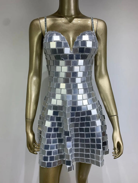 PDEP sexy suspenders elastic square lenses beaded club mini dress women stage gold night club skirt
