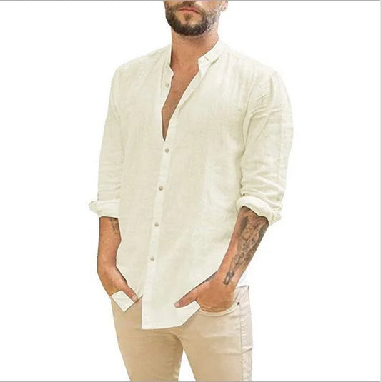New Fashion Men's linen cardigan solid color casual long sleeve shirt with standing collar