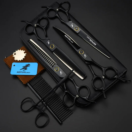 7 inch NEPURLson PB 01 black good quality 4 scissors pet sets Shaped Scissors Pet Grooming dense teeth scissors set