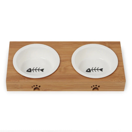 Ceramic Bowl Small Pet Dog Bamboo Wooden Bowl Elevated Stand Feeder Dining Table with White Double Cat Bowls