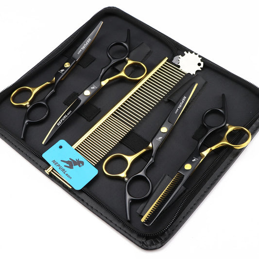 6.0 inch NEPURLson black gold screw scissors for dog grooming comb kit Animal Shaped Scissors Pet 4 scissors set