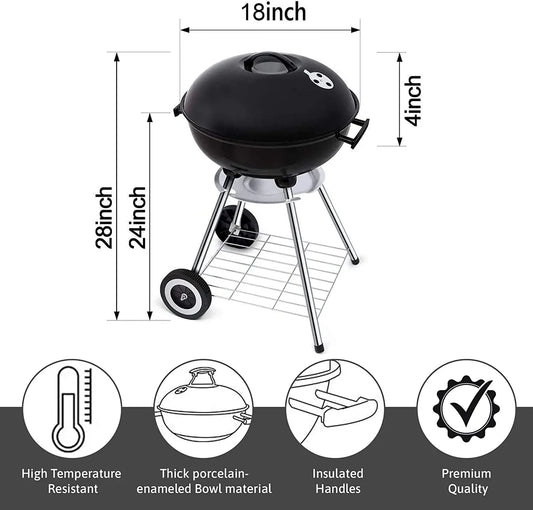 18 Inch Portable Charcoal Grill With Wheels Outdoor Cooking Barbecue Camping BBQ Coal Kettle Grill