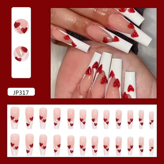 Press On Nail French Tips Flame Pattern Long Acrylic Nails Coffin Love Heart Full Cover Ballerina False Nail For Women