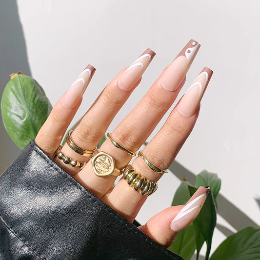 24pcs New Year's hot fakenails for 2022 Long Coffin French line Brown Nail Tips For Women