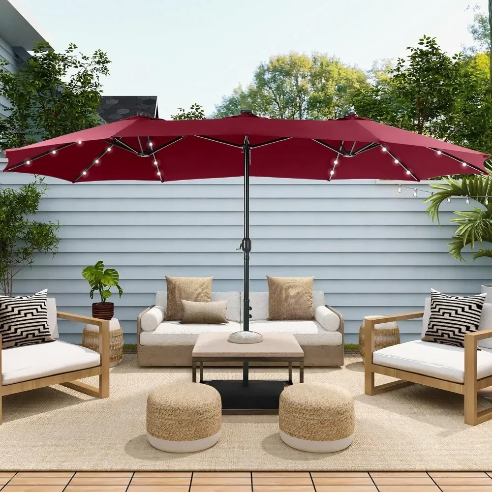 15 ft Extra Large Patio Umbrella with Solar Lights, Rectangular Outdoor Umbrella with Base Included, Dark Red