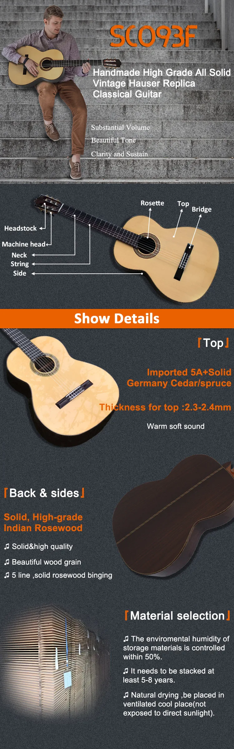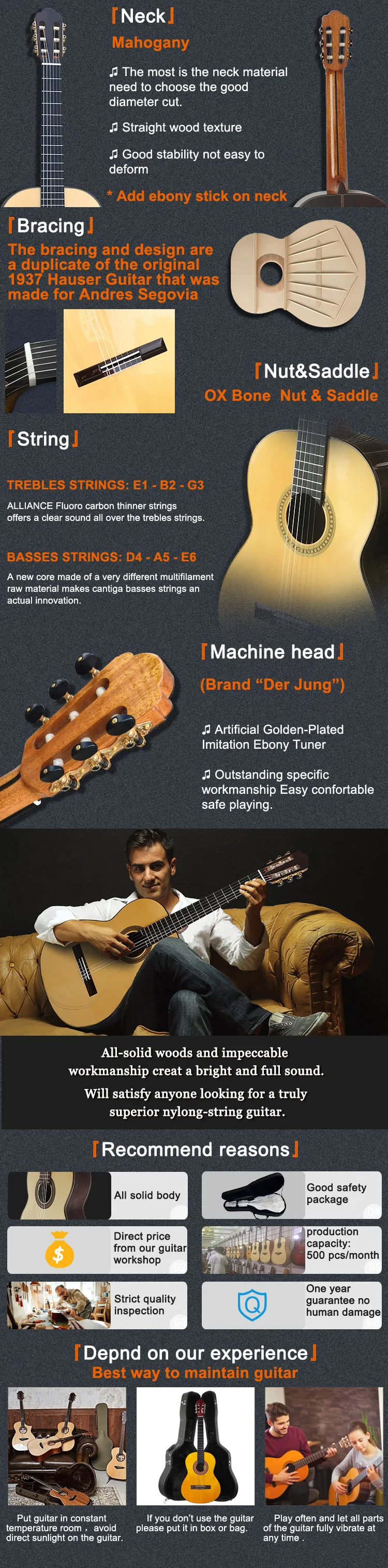 The 1937 Hauser Replica Classical Guitar is characterized by substantial volume, beautiful tone, clarity and sustain. The back and sides are made of solid, high-grade Indian Rosewood. The top is German Spruce. The bracing and design are a duplicate of the original 1937 Hauser Guitar that was made for Andres Segovia. Segovia refered to his Hauser guitar as “the greatest guitar of our epoch.” This model is made in the shop of world-acclaimed luthier, Yulong Guo, and the construction is supervised by him. The scale length is 650 mm, with a nut width of 52 mm. Position marker dots have been placed on the edge of the fret board at the 5th, 7th, and 9th positions.