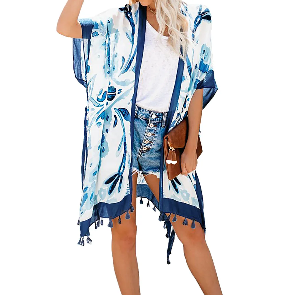 Women Kimono Bikini Water Prints Tassel Sexy POm Pom Swimwear Cover Up Beach Dress