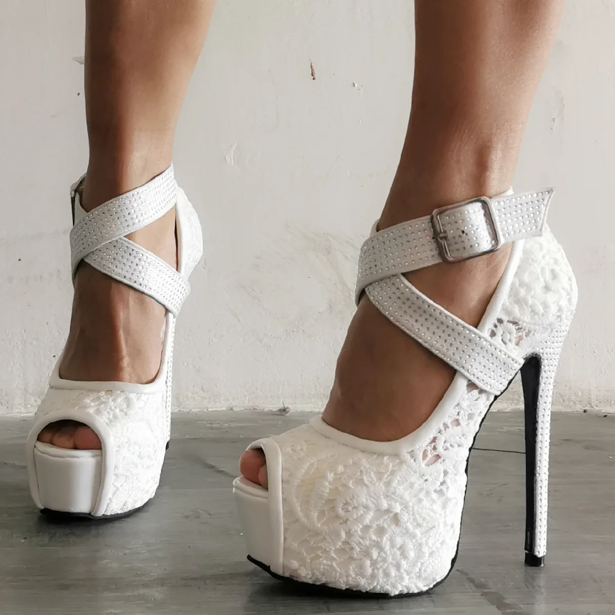 Women Plus Size 46 47 Pumps High Heels Platform Lace Mesh Shoes Wedding Peep Toe stilettos Dress White Sandals Ladies