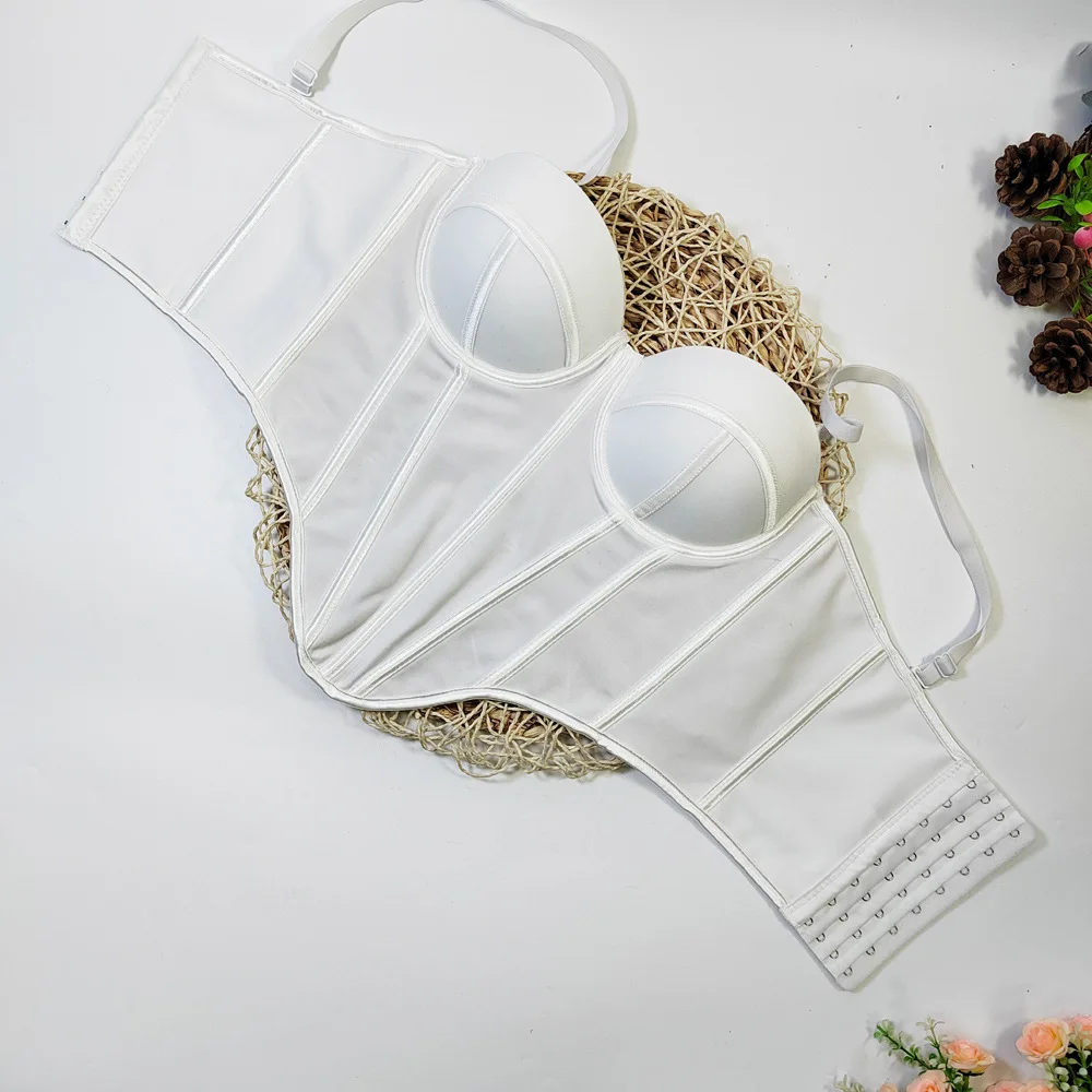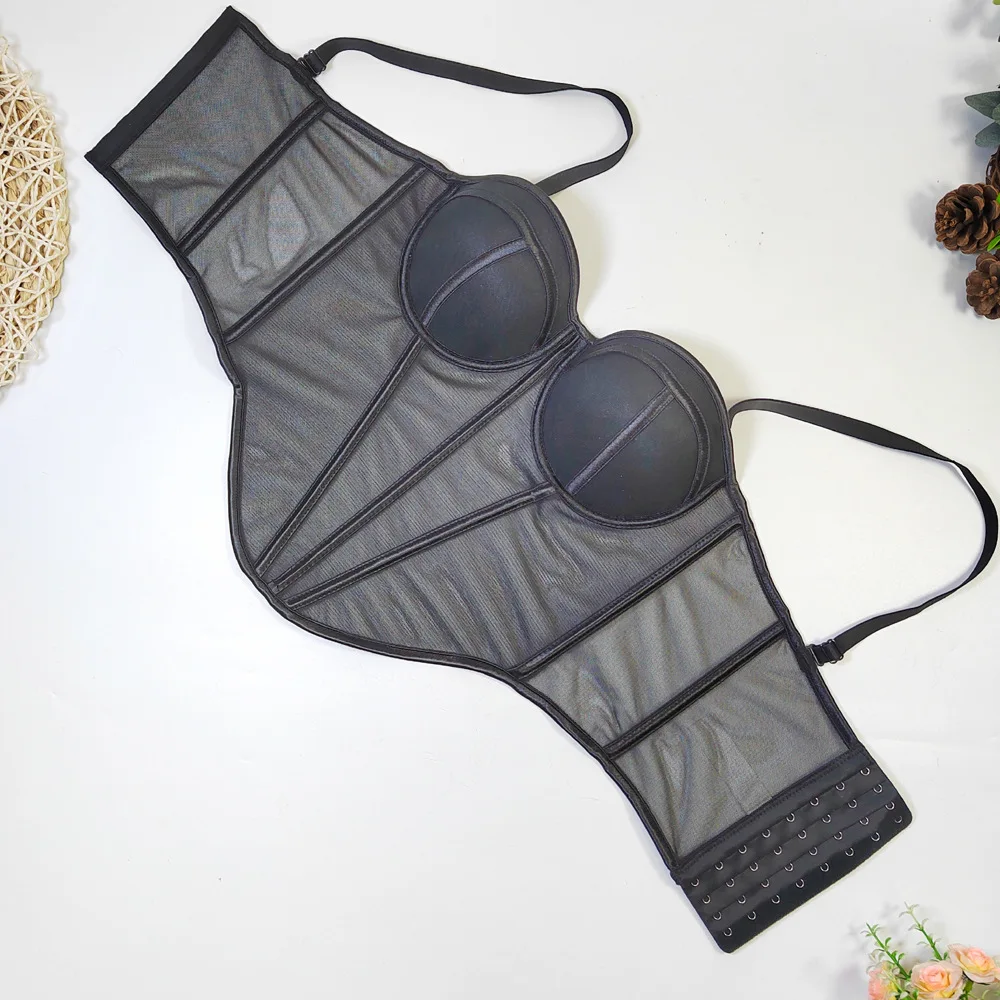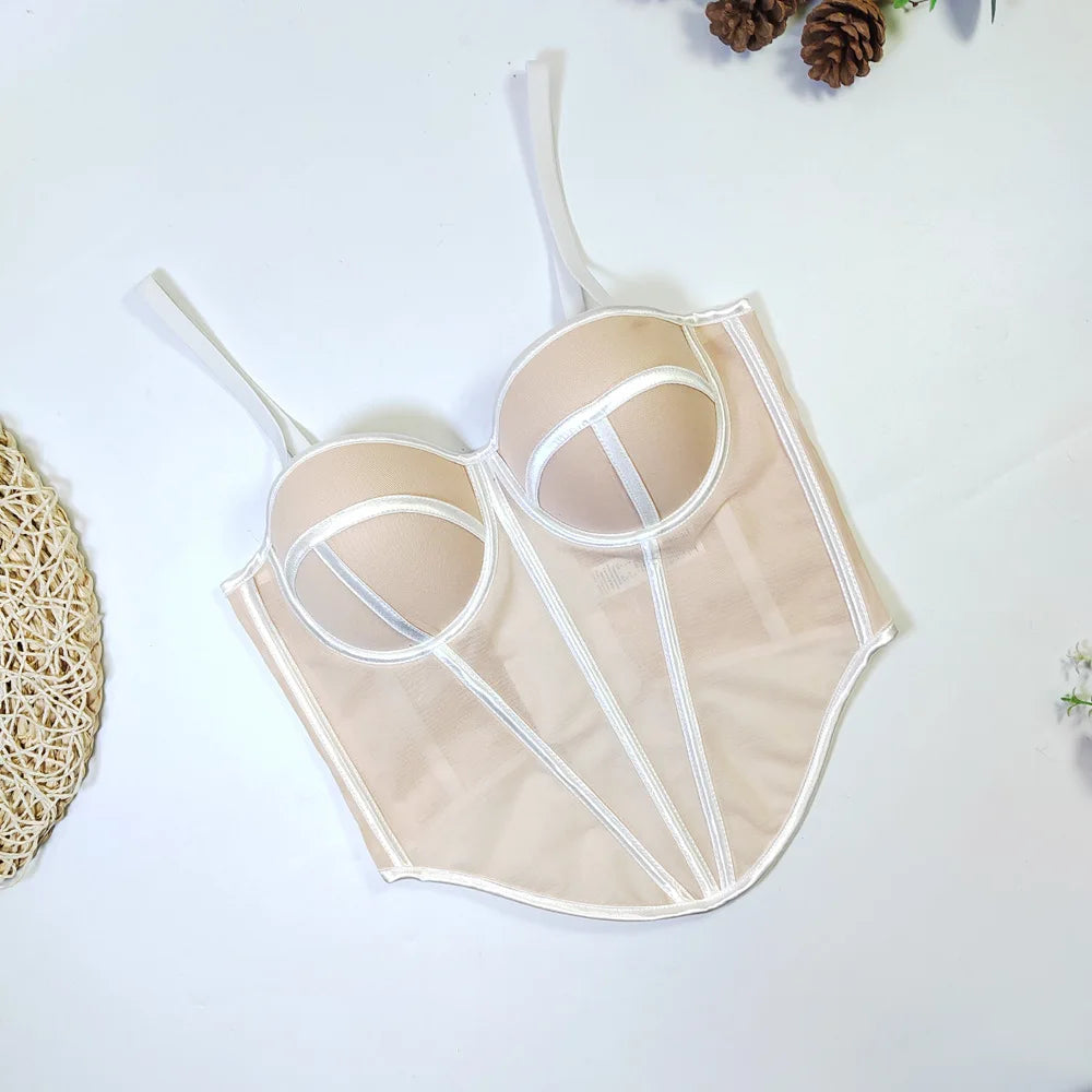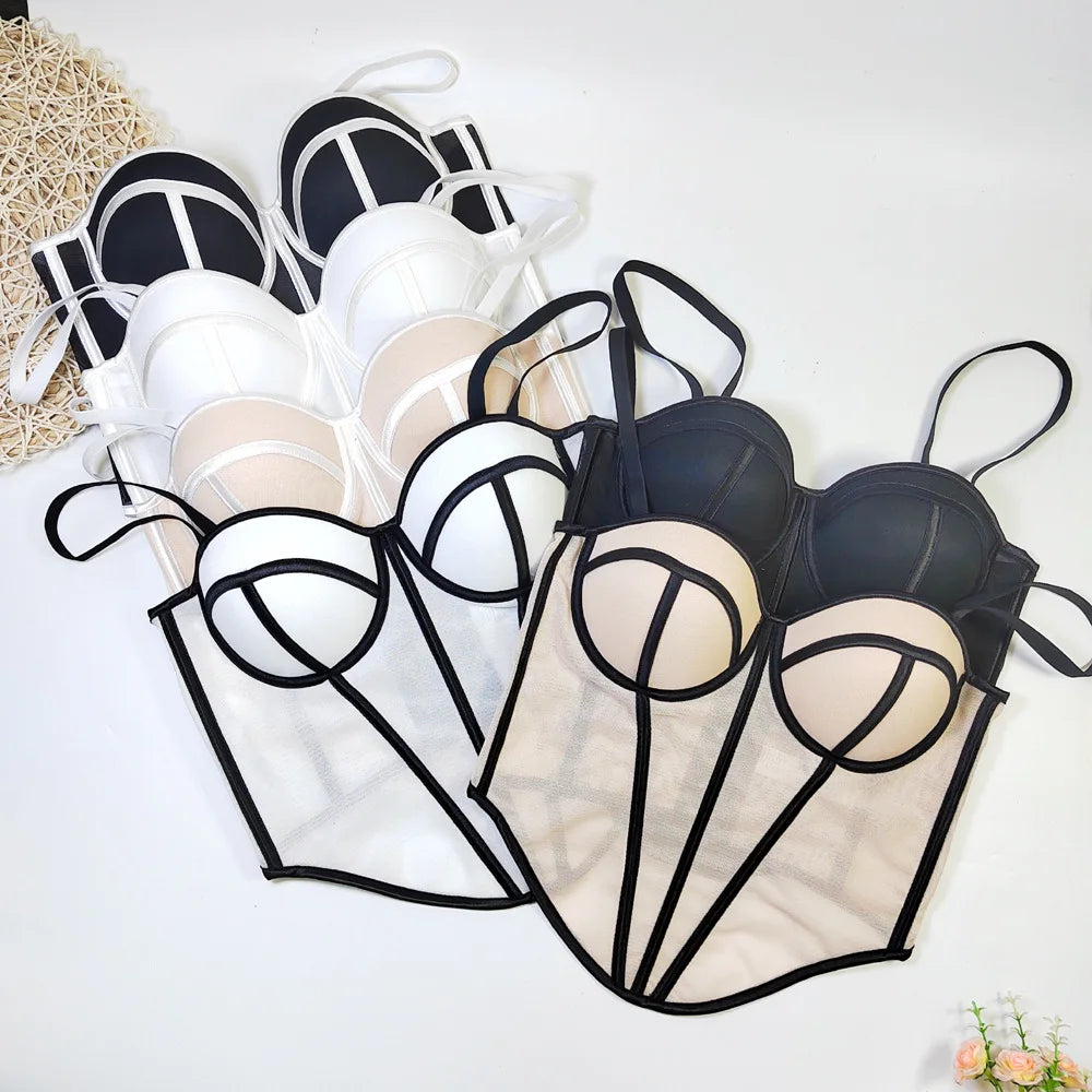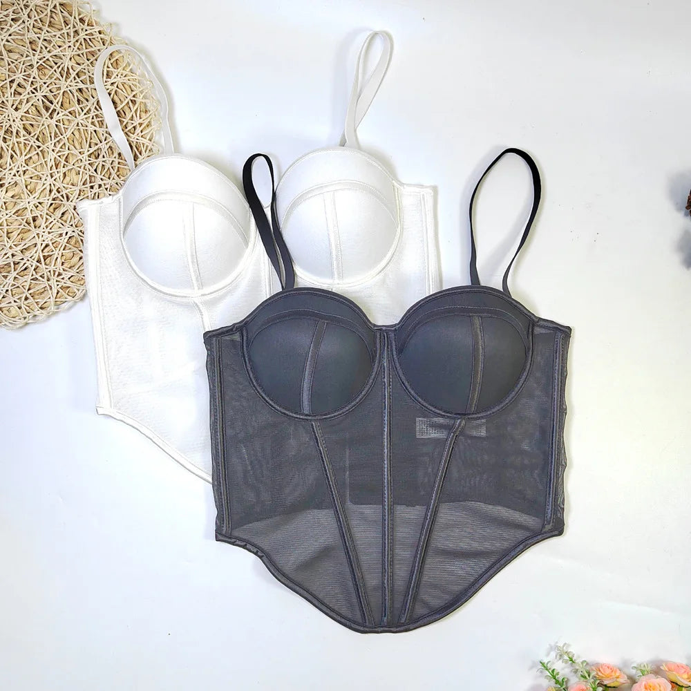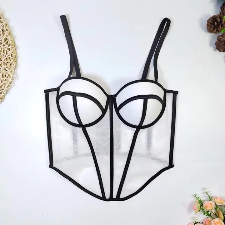 Women Sexy Mesh Irregular Corset French Unique Contrasting Lines Ladies Bustie Party Blackless Design Cropped Top Vest Tank Top