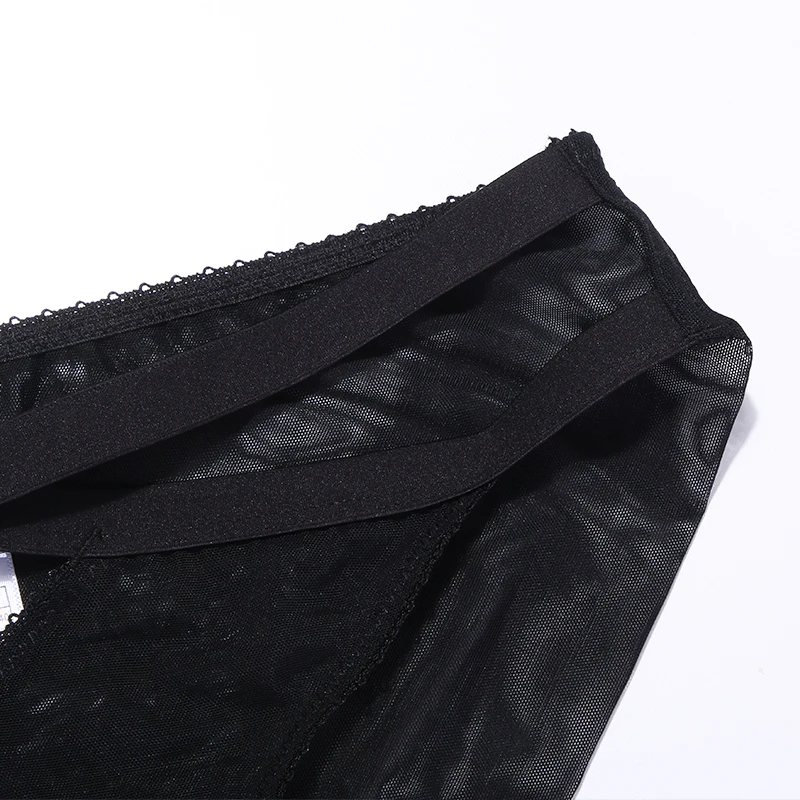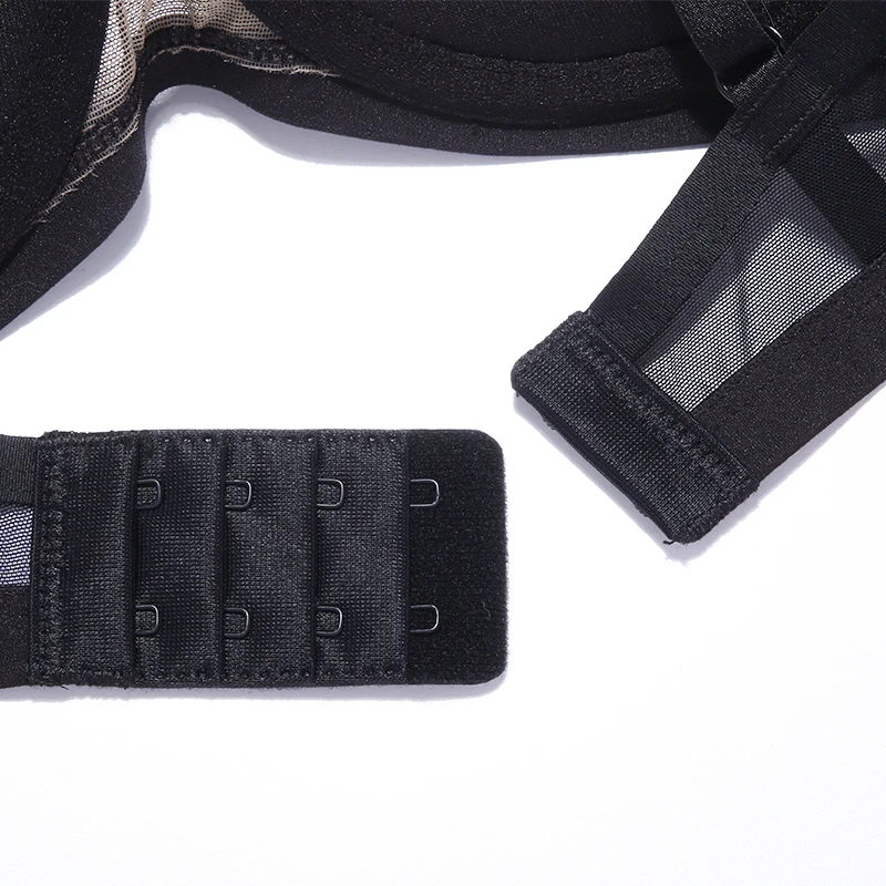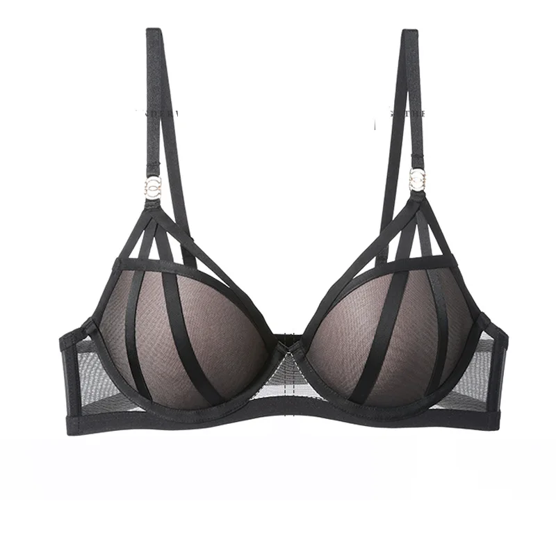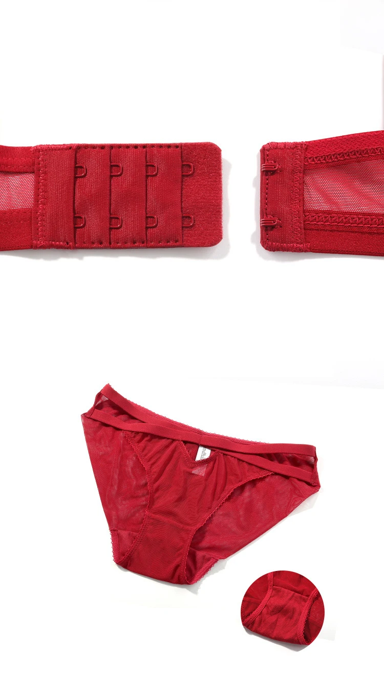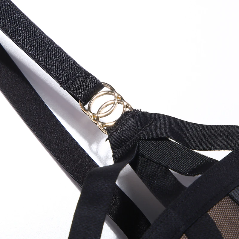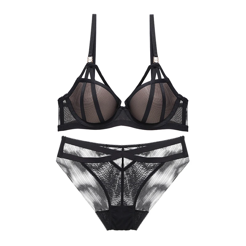 Women Strappy Sexy Lingerie Female Two-pieces Lace Mesh Bra Panties Set Solid Push Up Padded Underwire Metal Decor Underwear