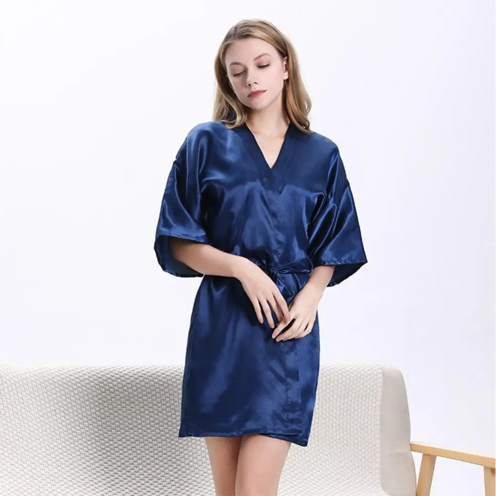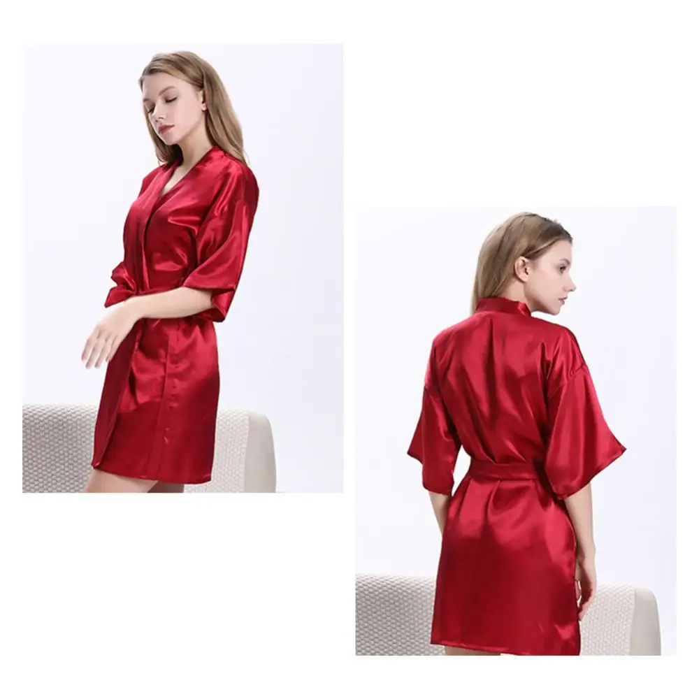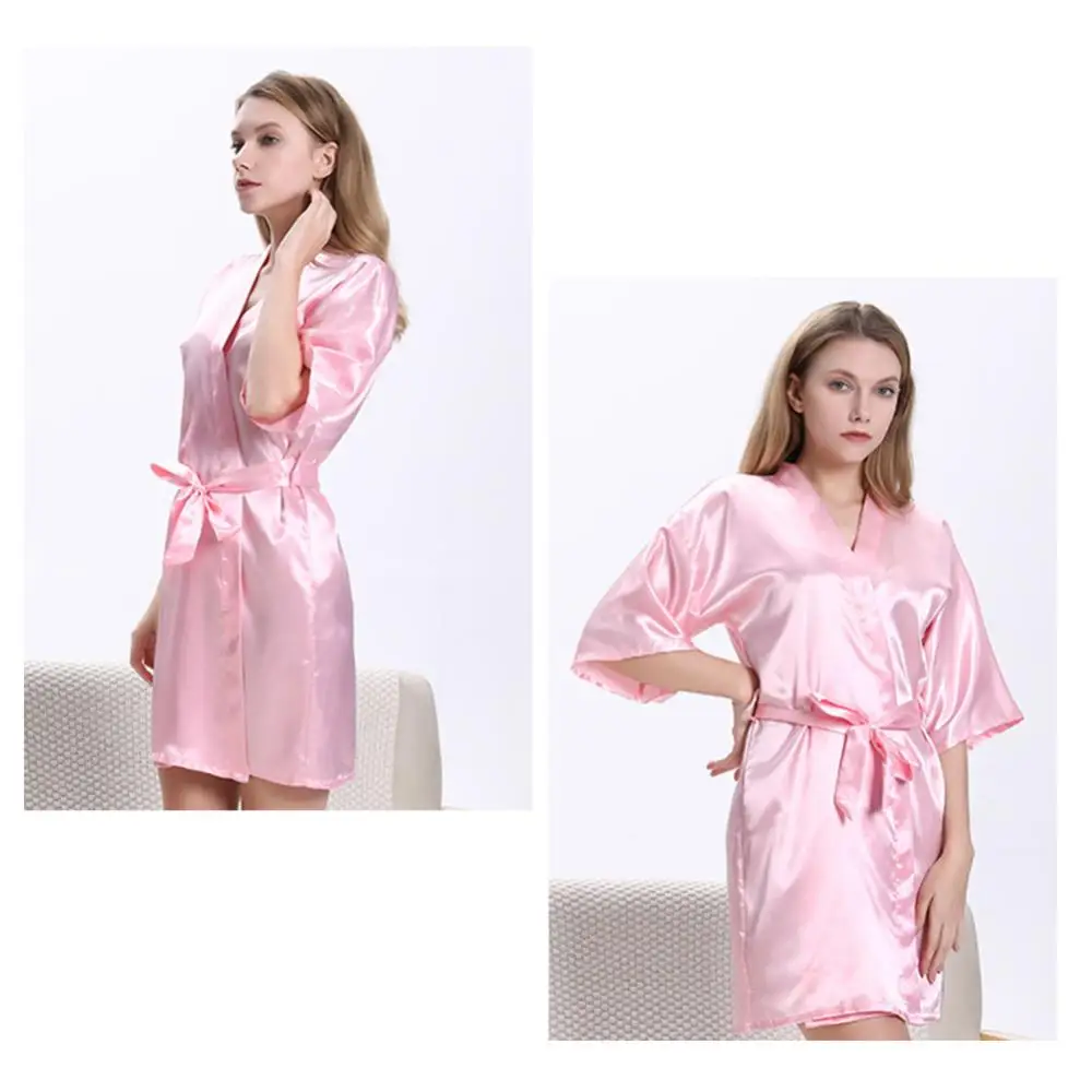 Women Summer Solid Color Ice Silk Nightdress Midi Dress Bath Robe Waist Belt Sleepwear Nightgown Lady Homewear
