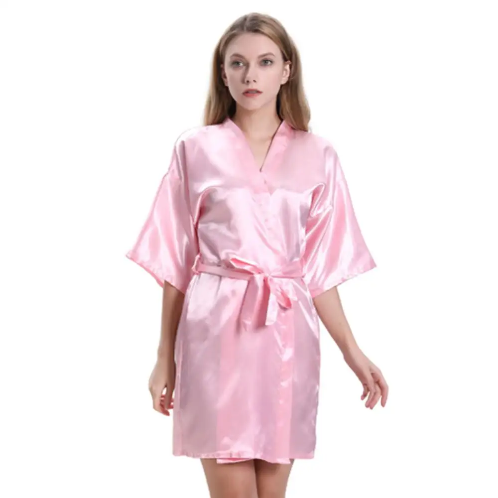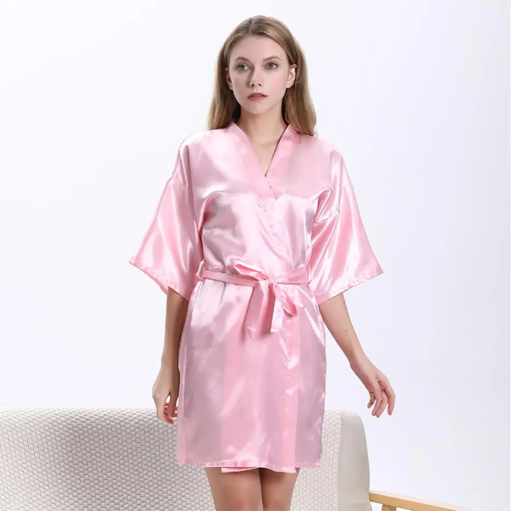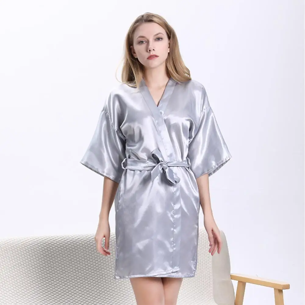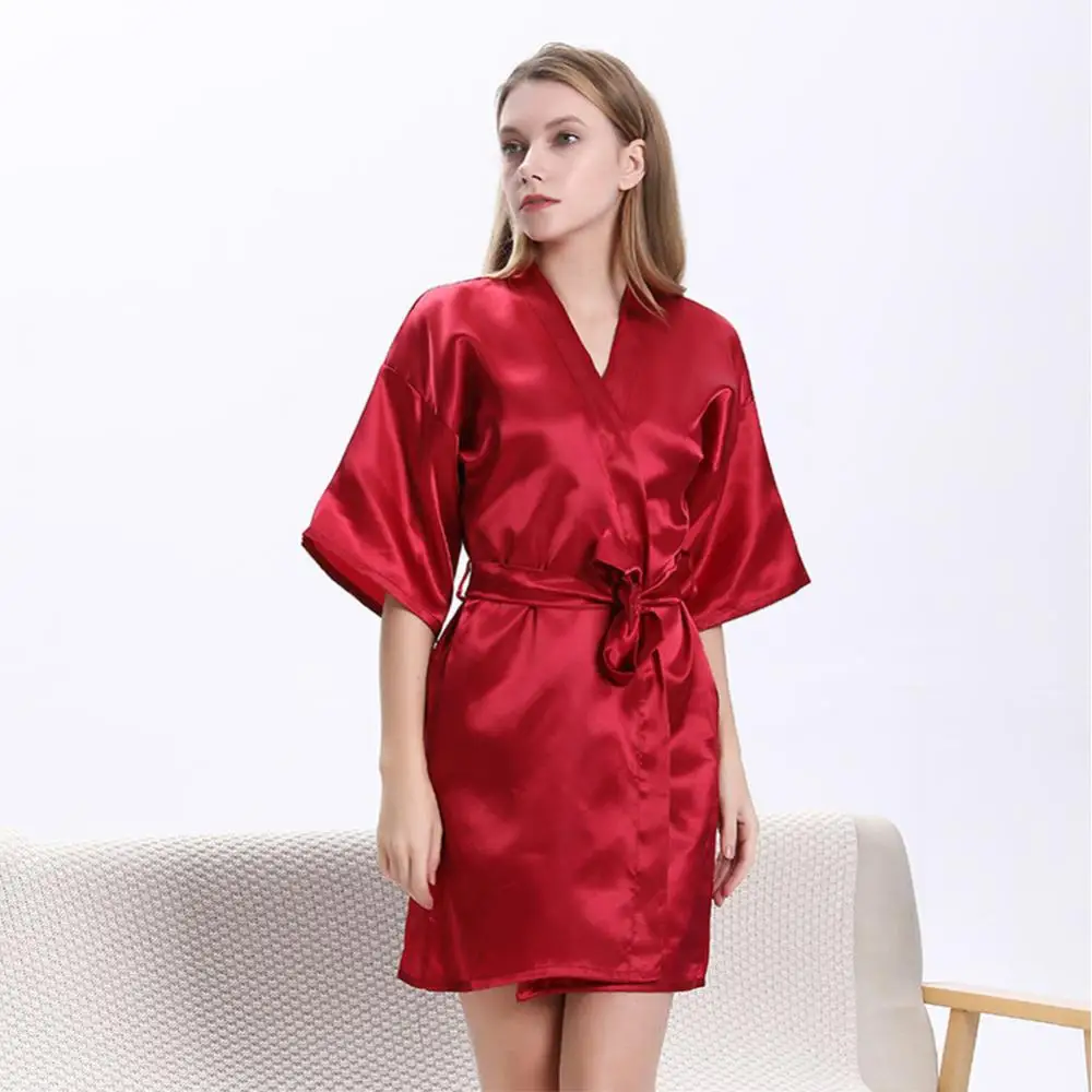 Women Summer Solid Color Ice Silk Nightdress Midi Dress Bath Robe Waist Belt Sleepwear Nightgown Lady Homewear