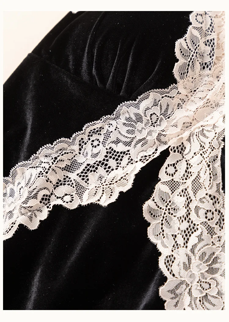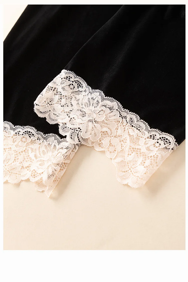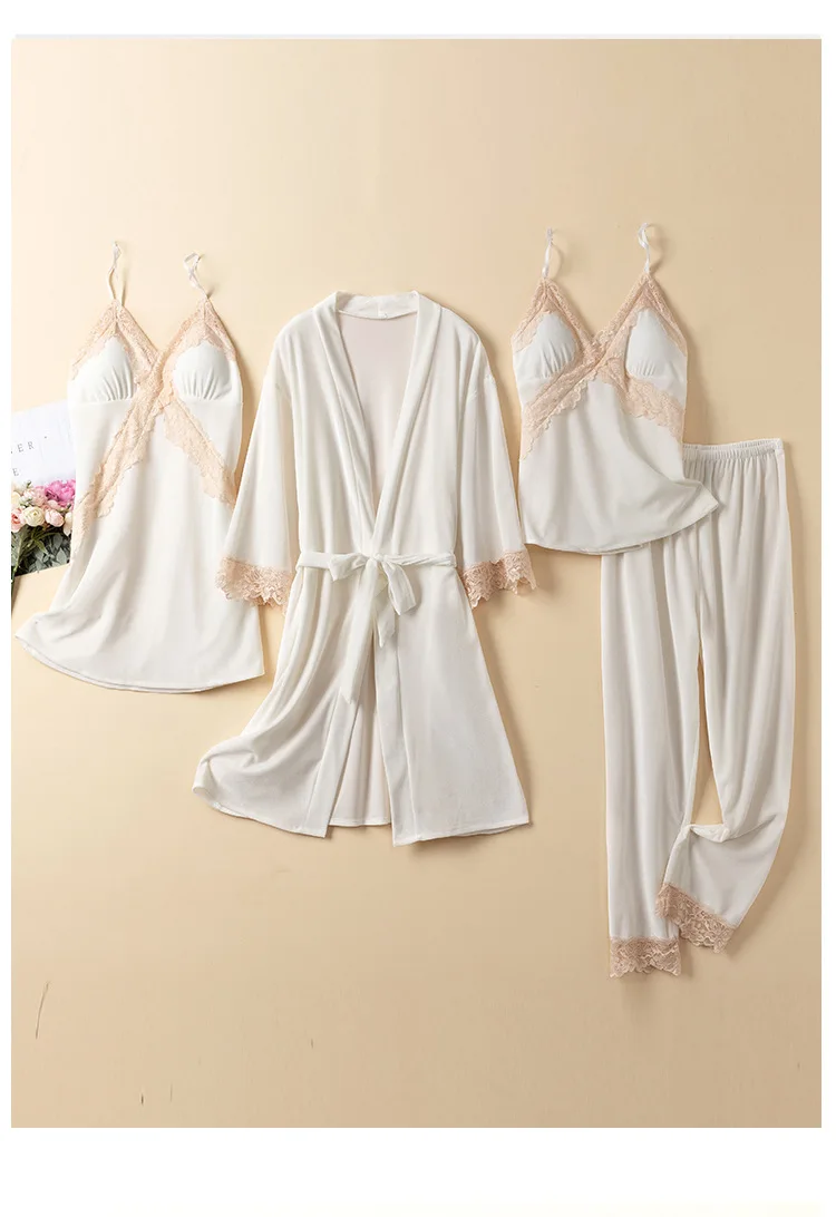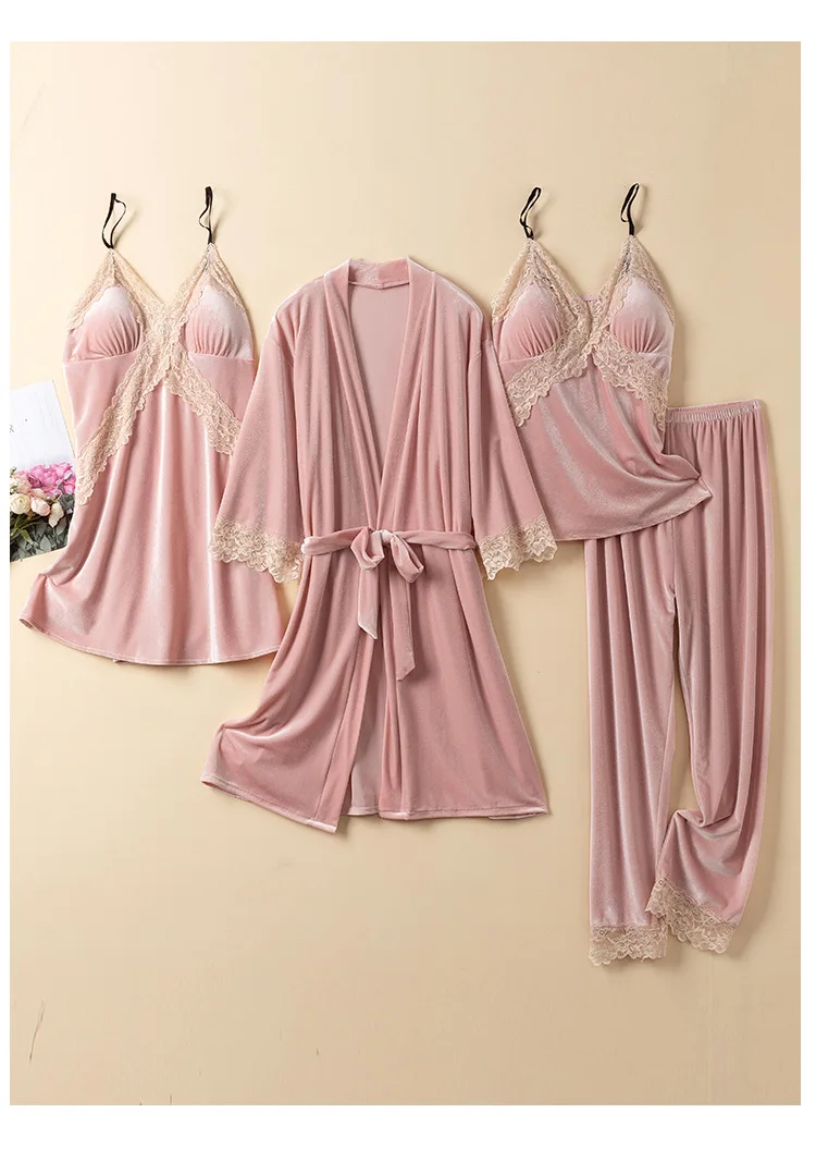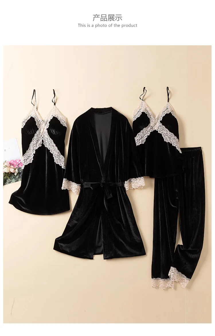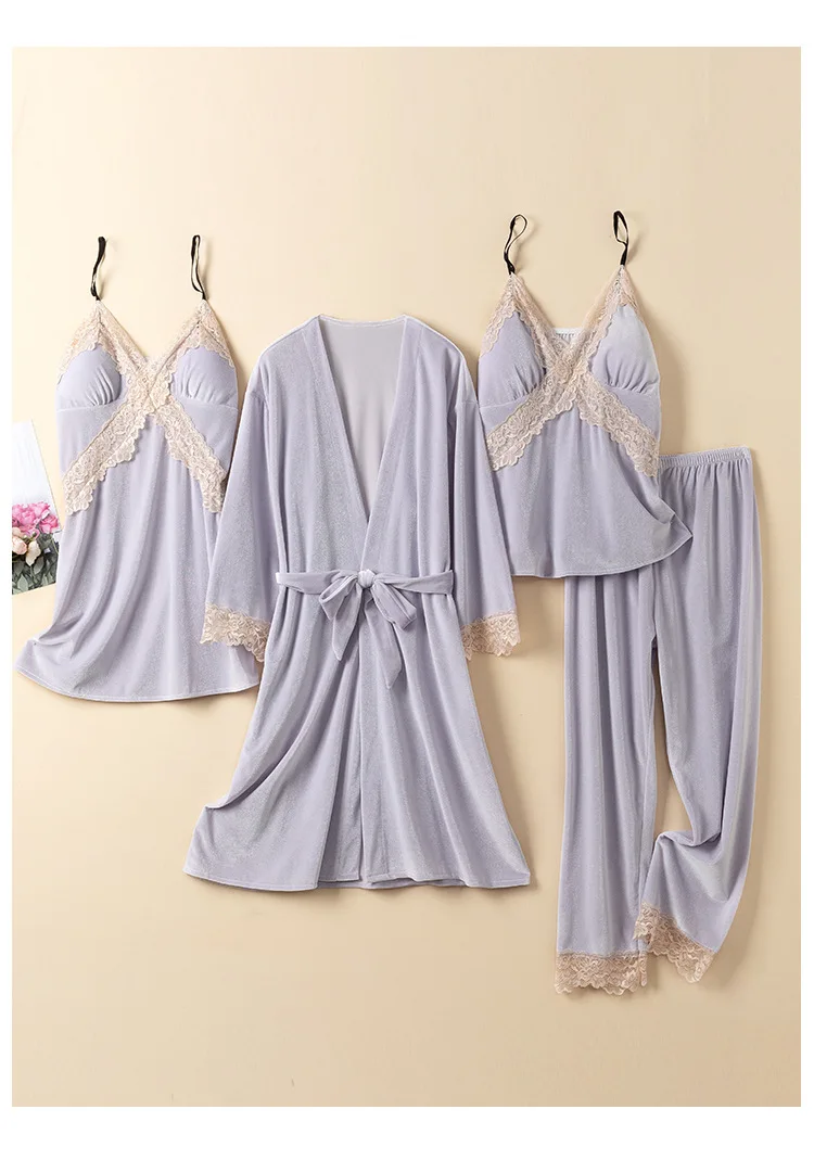 Women Velvet 4PCS Pajamas Set Sleepwear Autumn Winter Sexy Lace Trim Bathrobe Nightgown Loose Velour Pyjama Pour Femme Home Wear