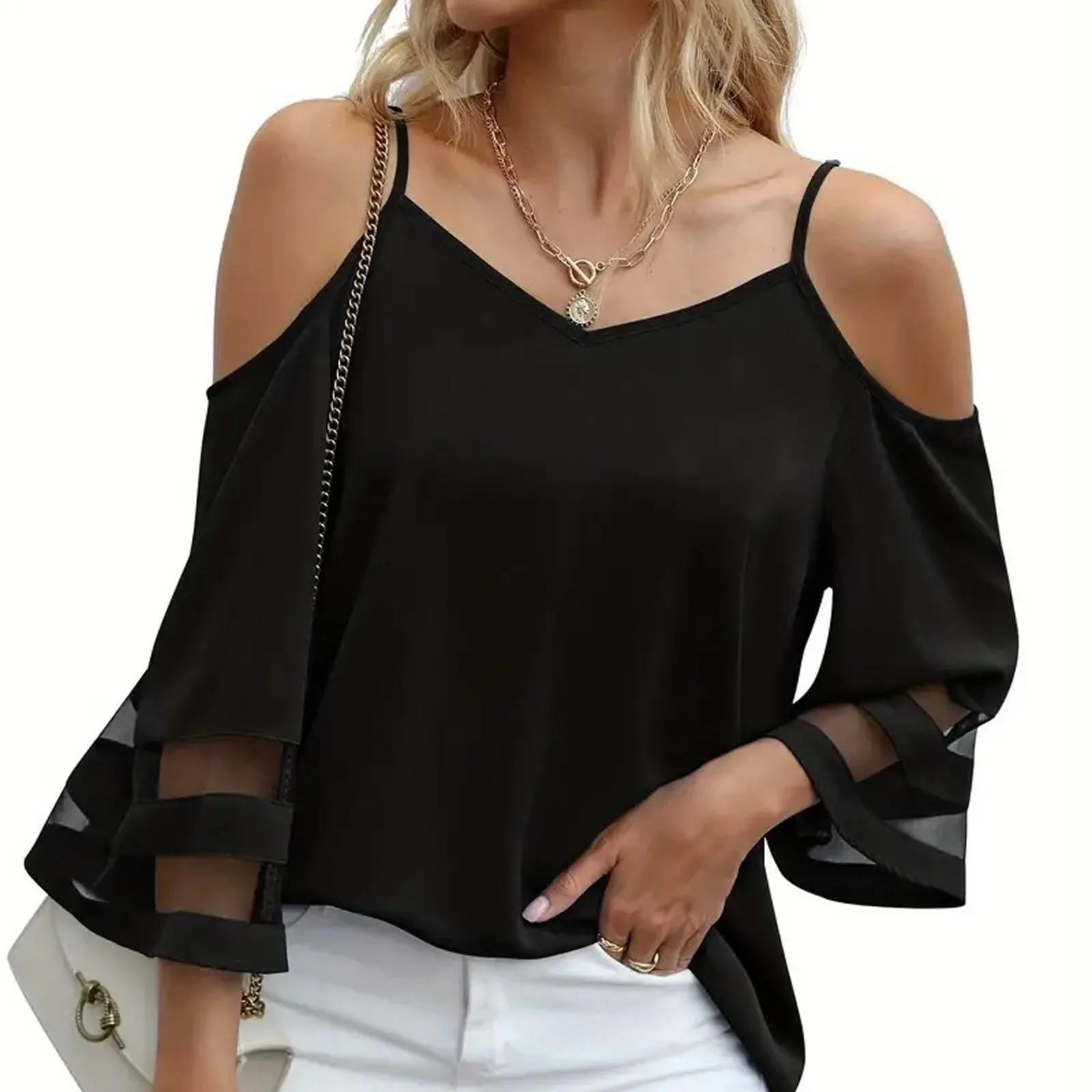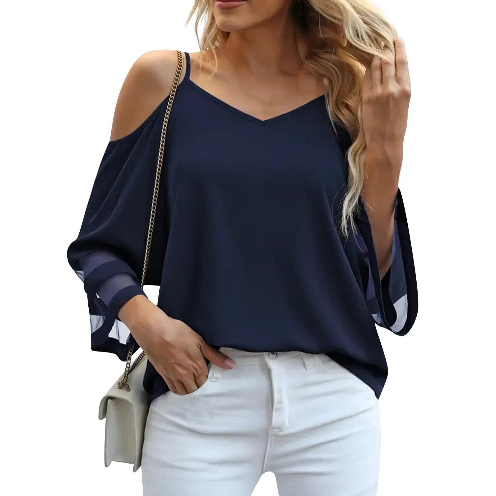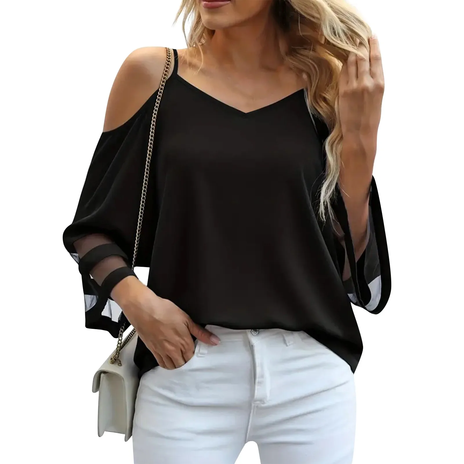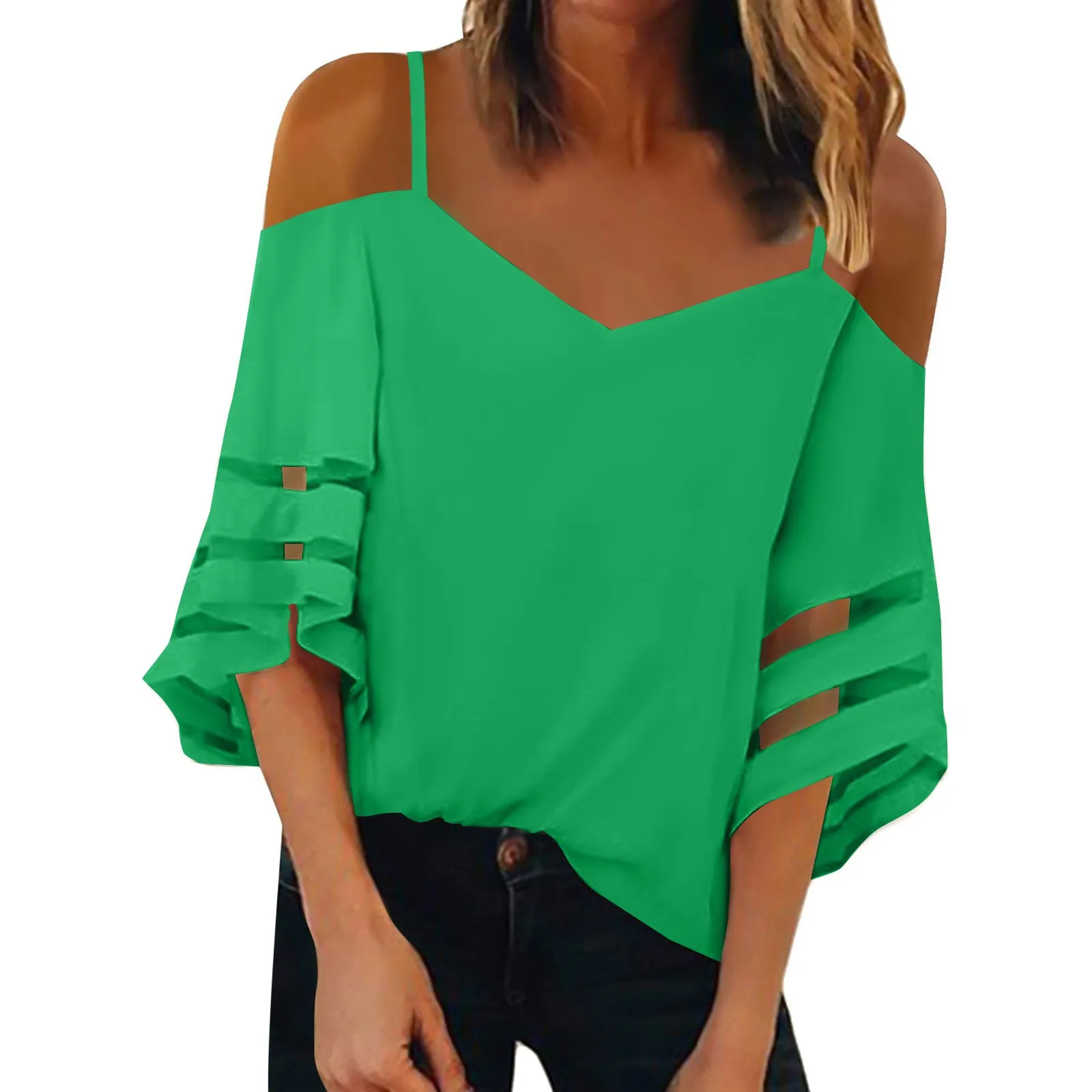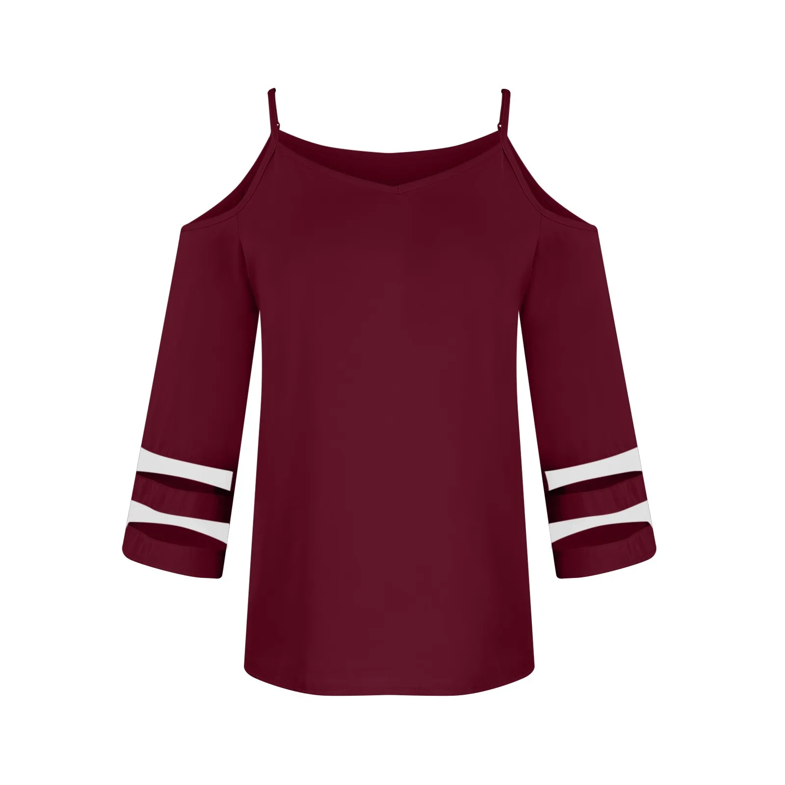 Women's Fashion Loose V-Neck Solid Color 3/4 Sleeve Casual Shoulder Strap Top