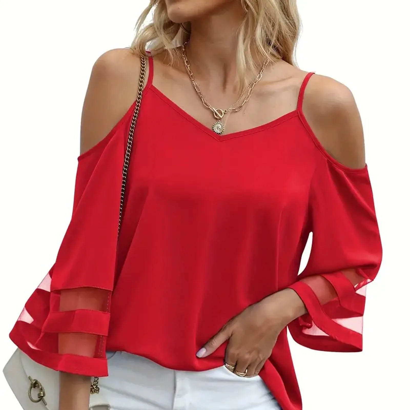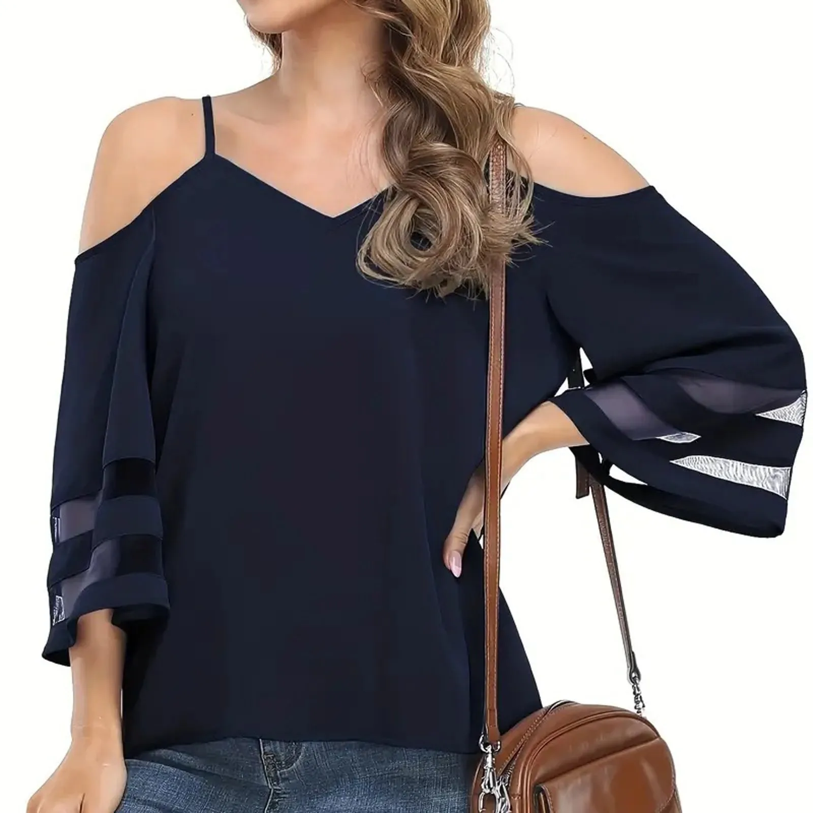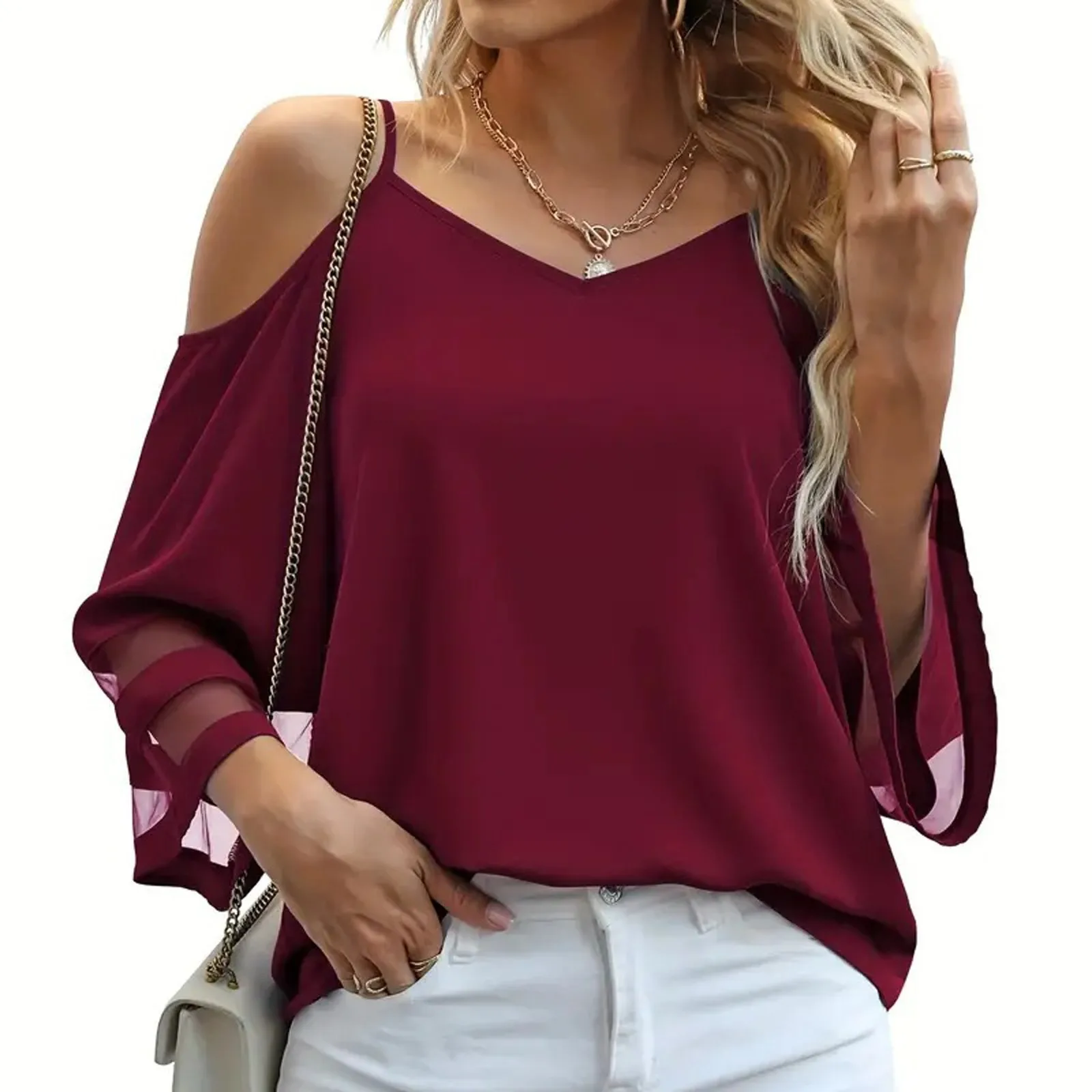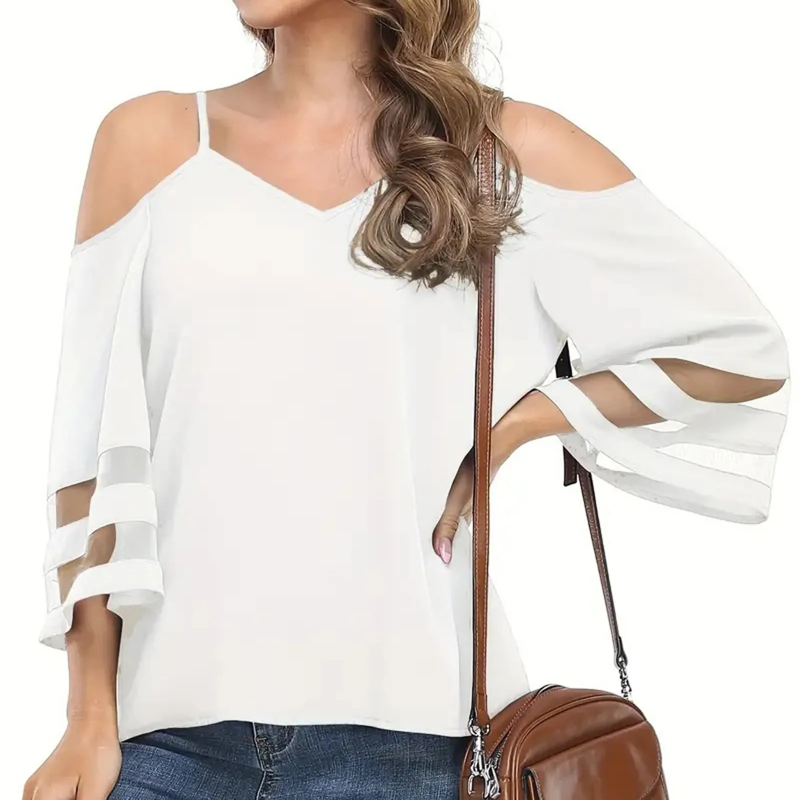Women's Fashion Loose V-Neck Solid Color 3/4 Sleeve Casual Shoulder Strap Top