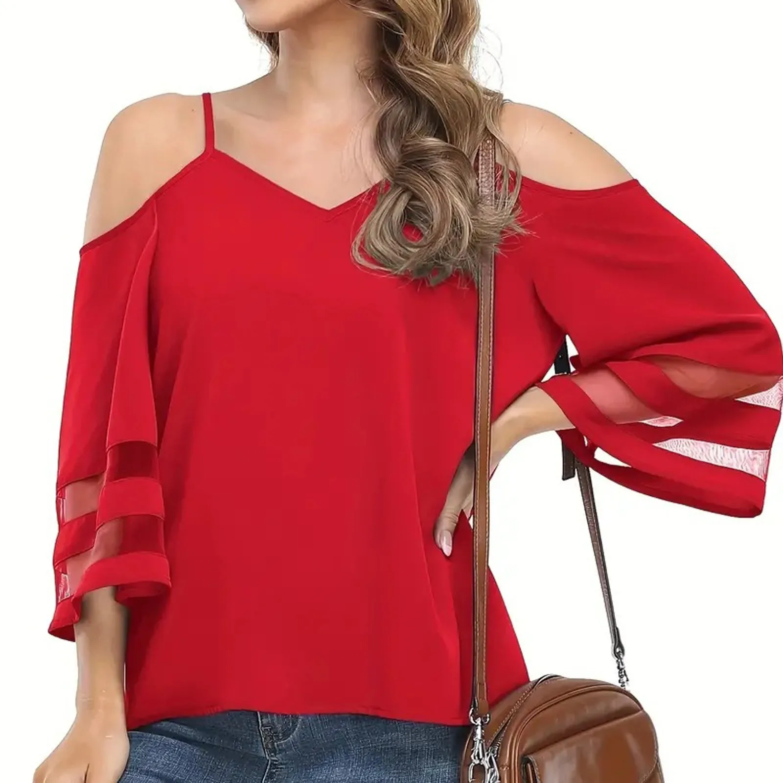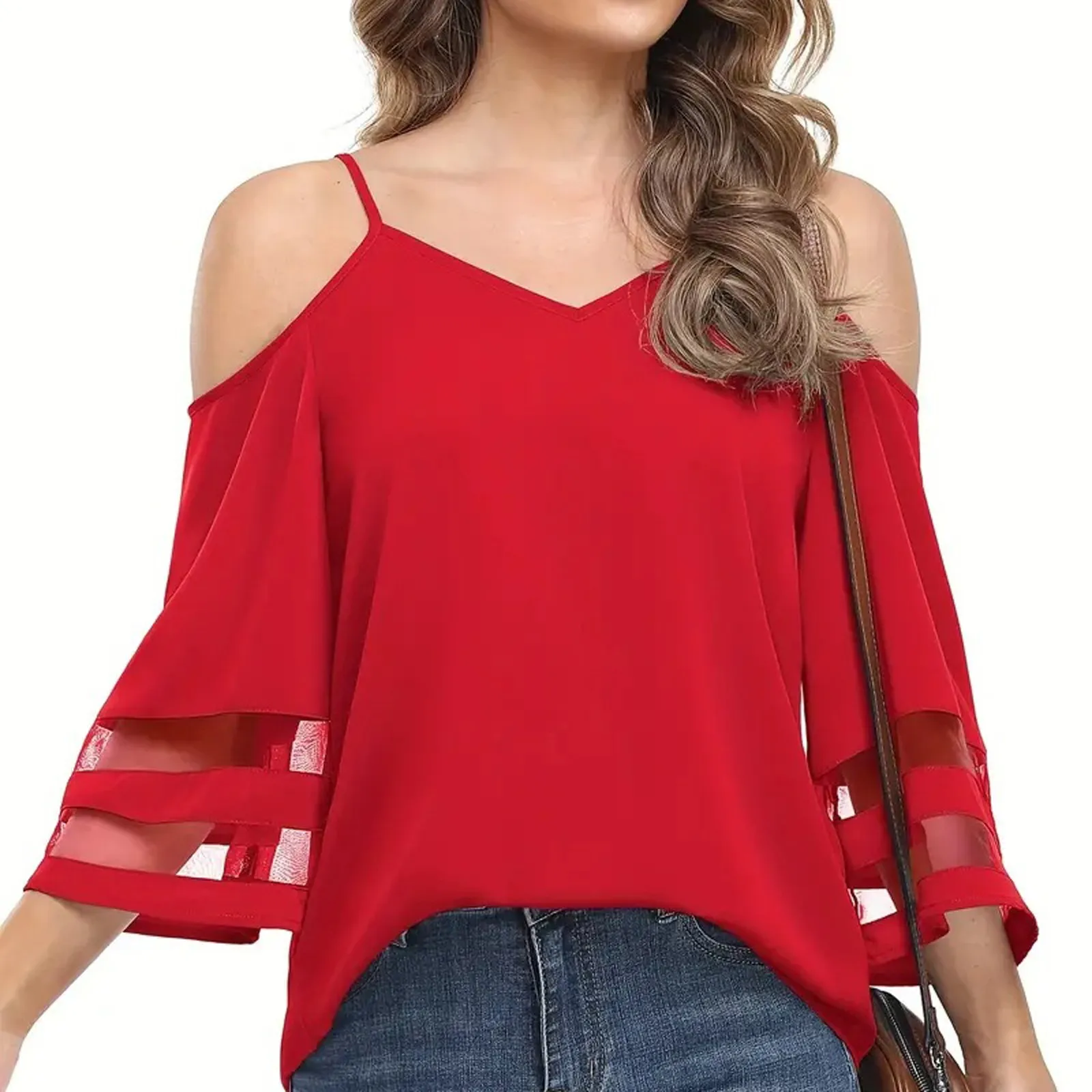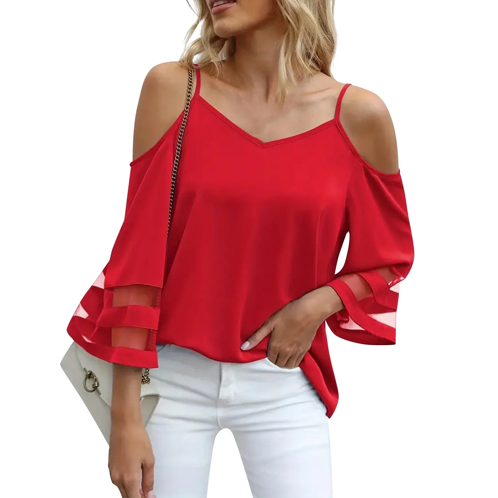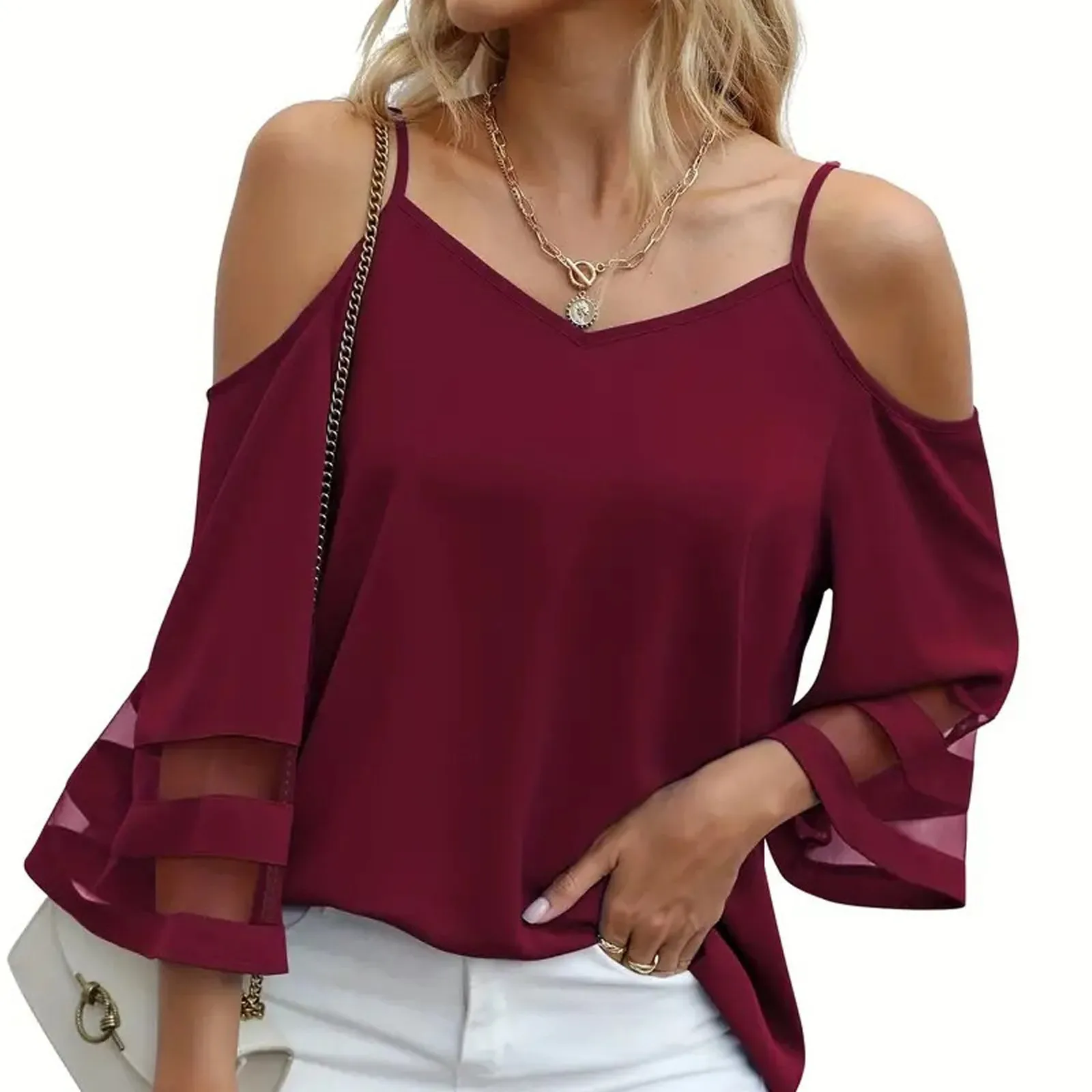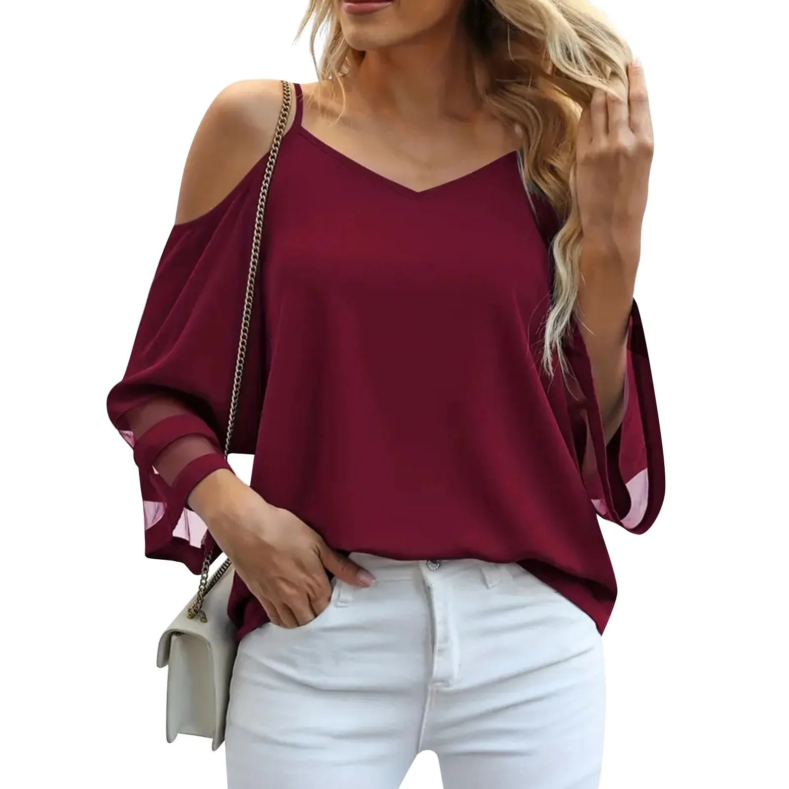 Women'S 3/4 Sleeve Tops Fashion Loose V-Neck Solid Color Casual Shoulder Strap Top Daily Commute Elegant All-Match Comfy Tops