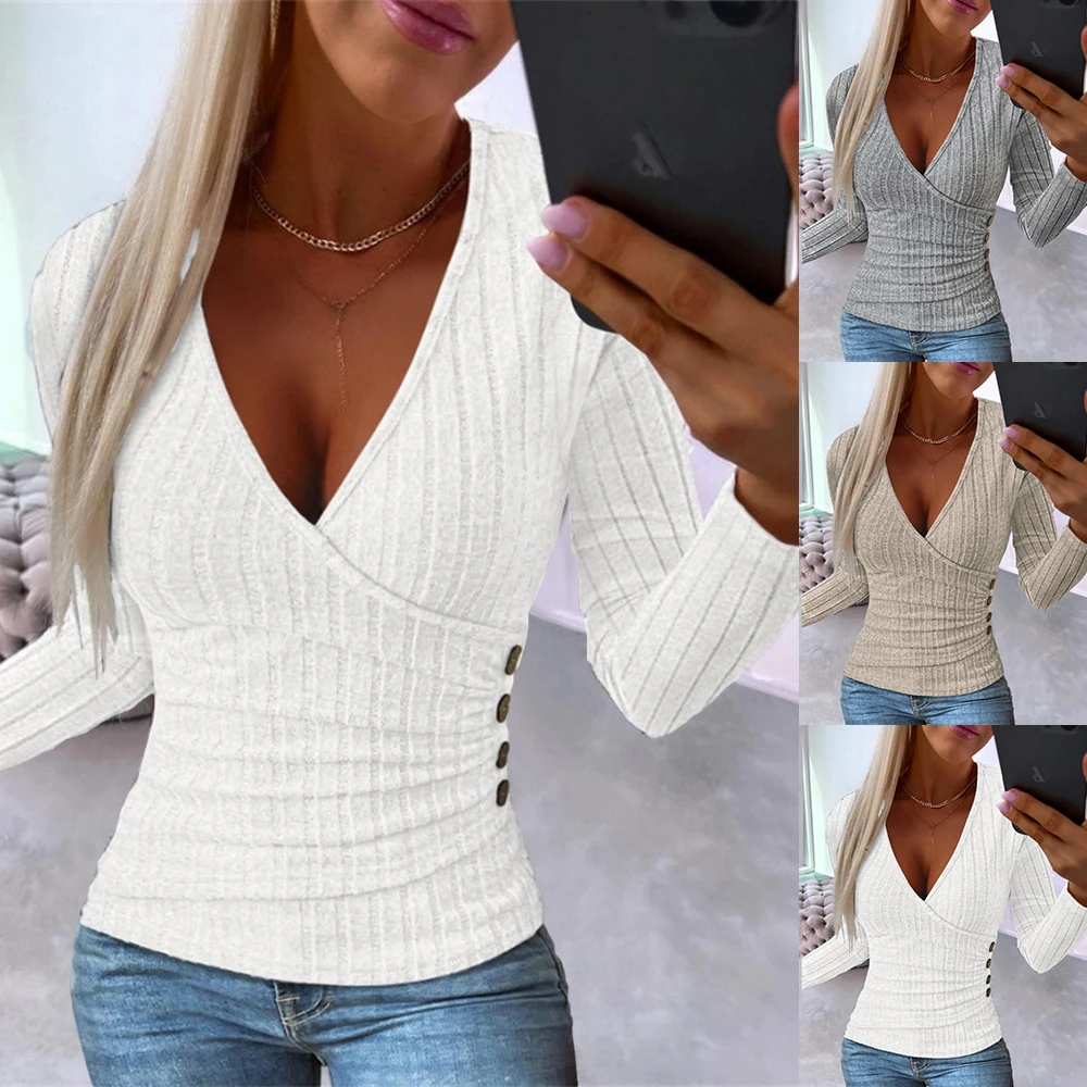 Women's Autumn Ribbed V Neck Wrap Tops Elegant Ladies Slim Long Sleeve Pullover Jumper T-Shirt Clothing 2023