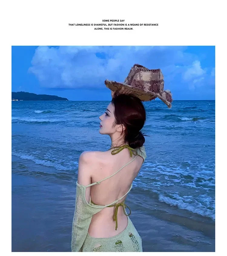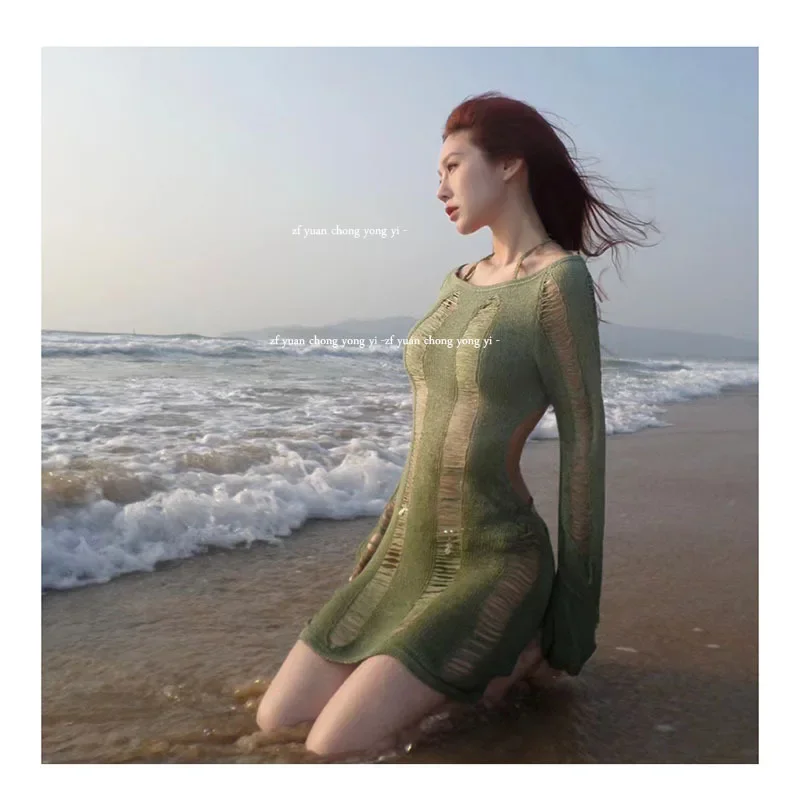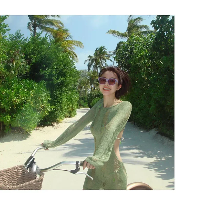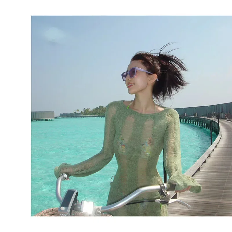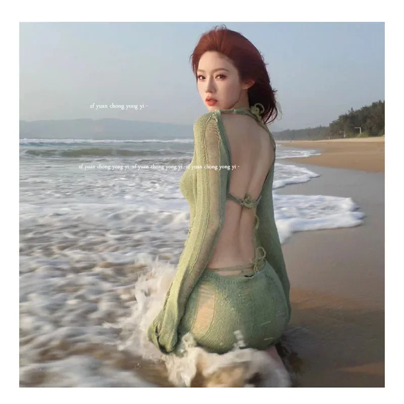 Women's Long Sleeved Solid Color Knitted Anti Wrinkle Cover Shirt, Beach Travel with Bikini Swimsuit, Sexy Hip Hugging Skirt