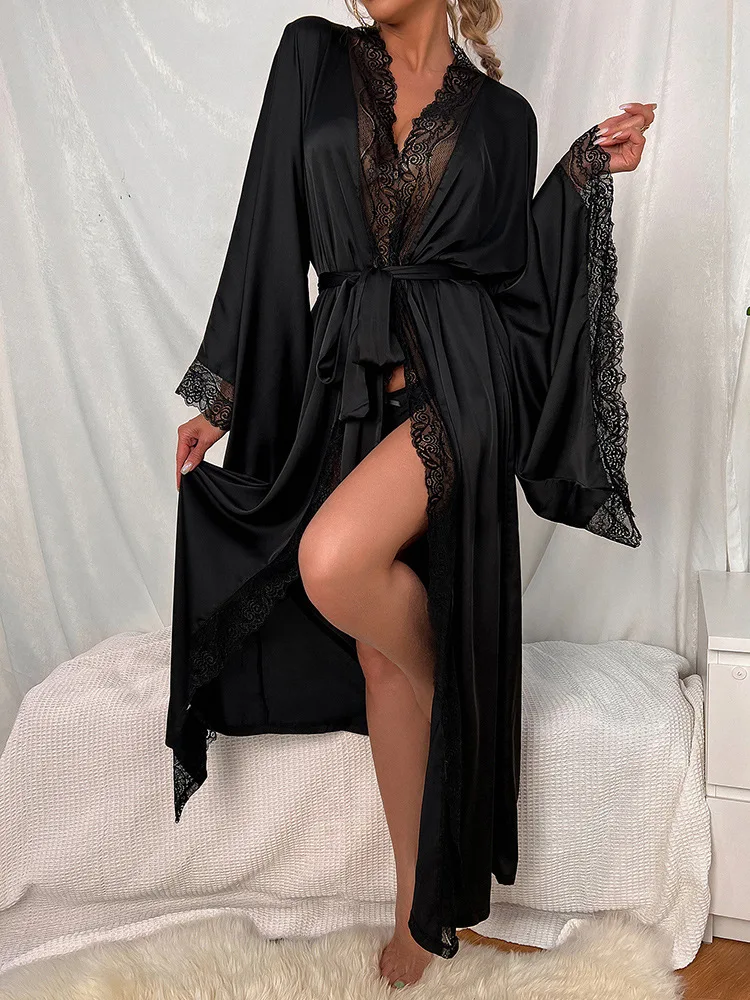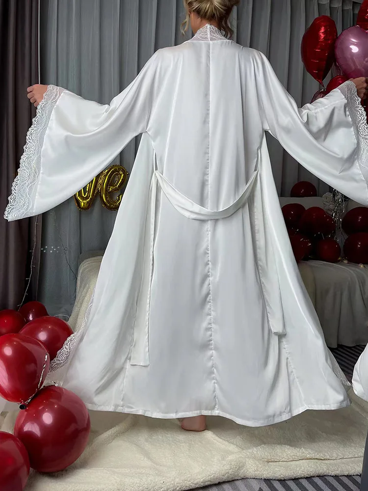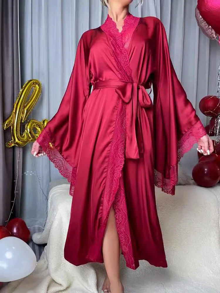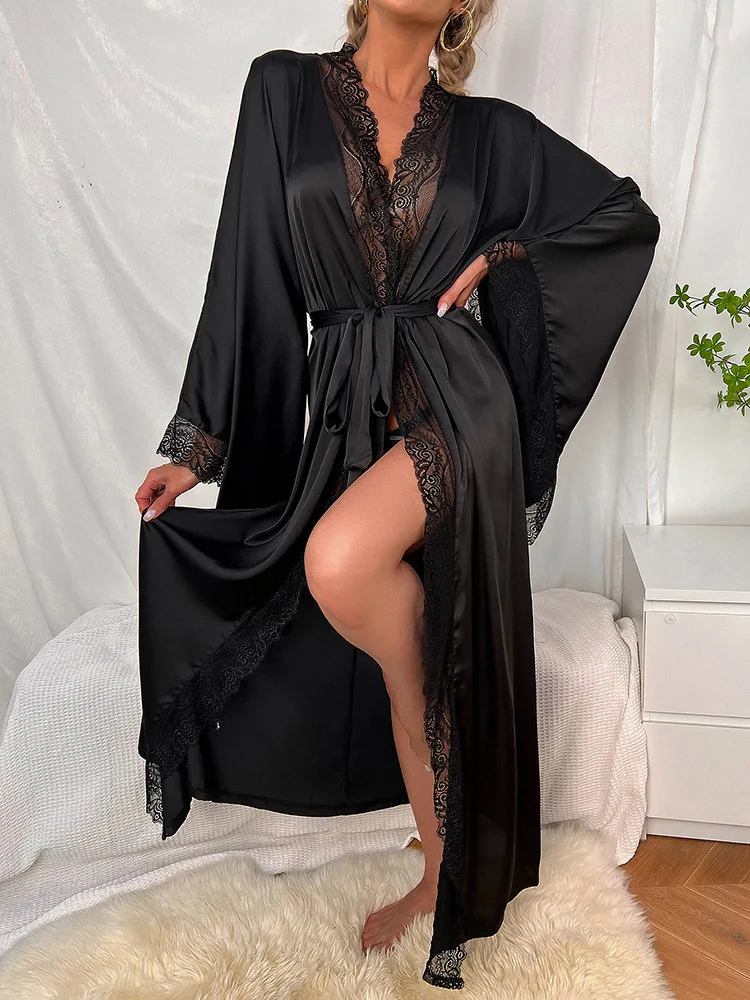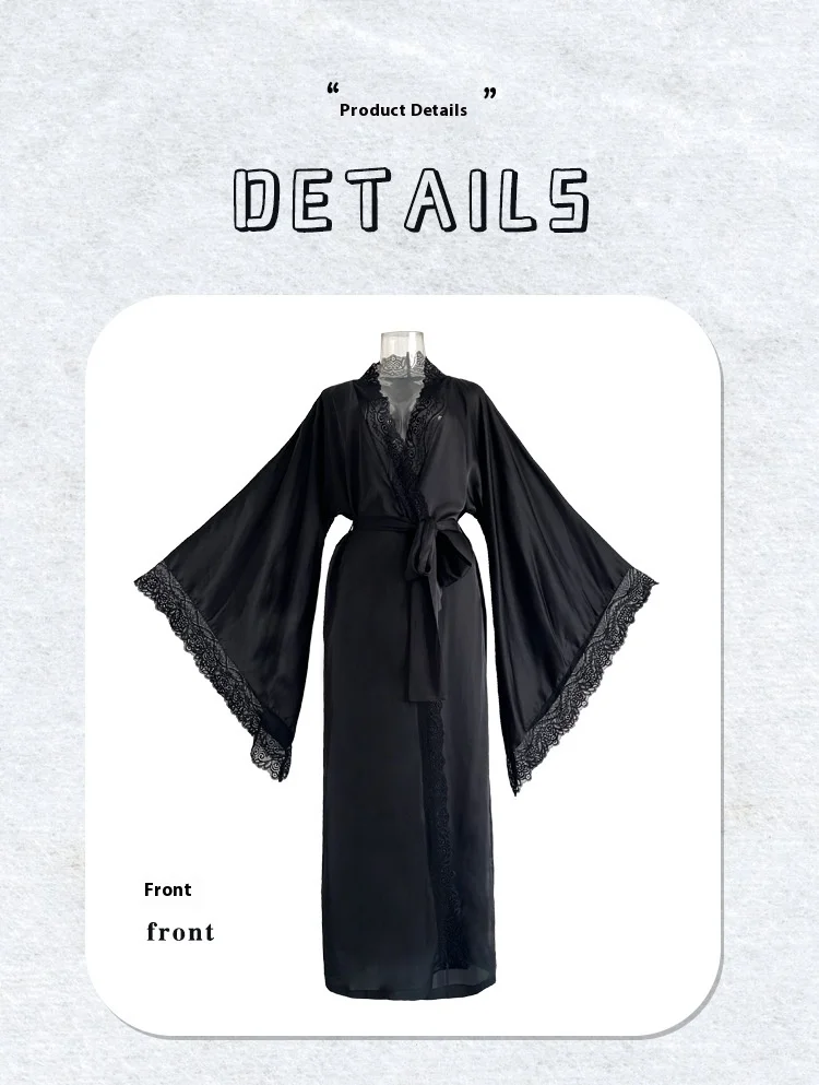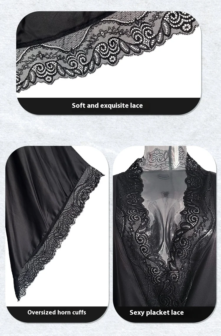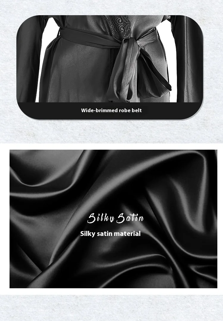 Women's New Sexy Satin Robe Pajamas Homewear Lace Light Luxury Long-Sleeved Ice Silk Robe Bathrobe Homewear Sexy Pajamas