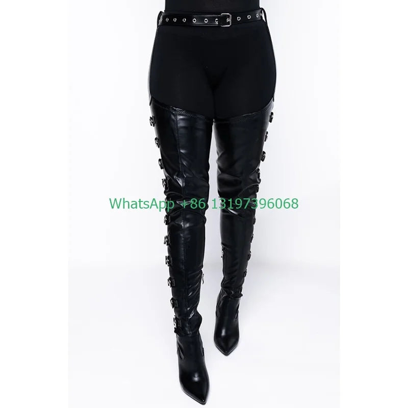 Women's Pointed Toe Thigh Boots Belt Leather Boots Sexy Hollow Metal Buckle Boots Catwalk Style Pole Dance Boots Plus Size Foot