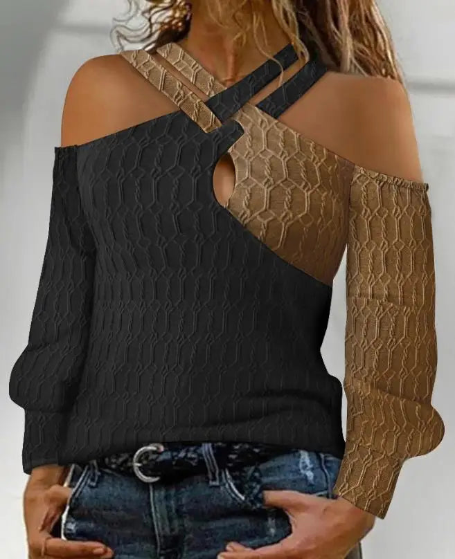 Women's Tops 2023 Autumn Casual Colorblock Criss Cross Cold Shoulder Cable Textured Top Long Sleeve Tee Fashion Pullover