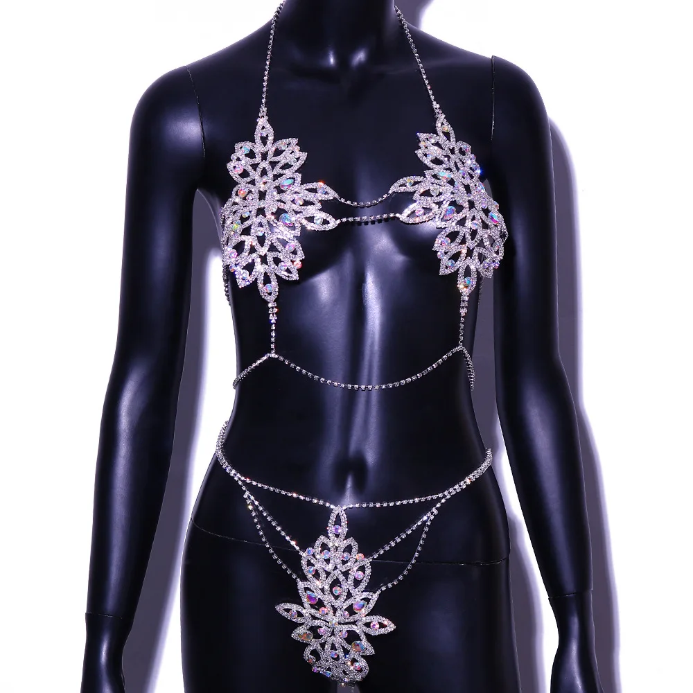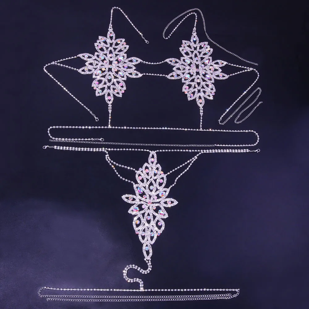 XP Sexy Women Flower Shaped Top Bra Panties Sets Crystal Lingerie Bikini Underwear Thong Body Chain Jewelry Colorful Rhinestone